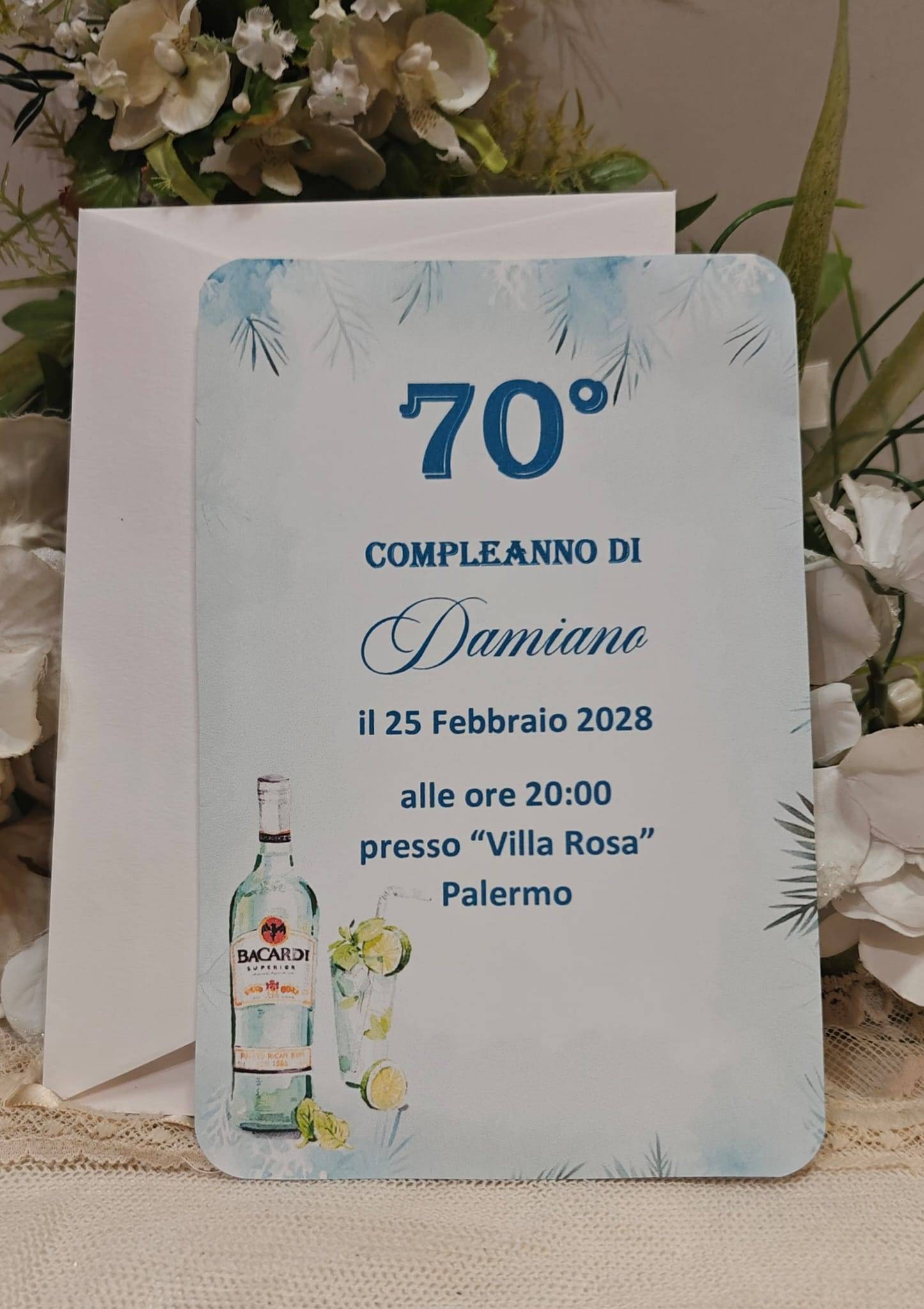 Invito personalizzato Compleanno 70 anni. Realizzato in cartoncino pregiato gr. 200.