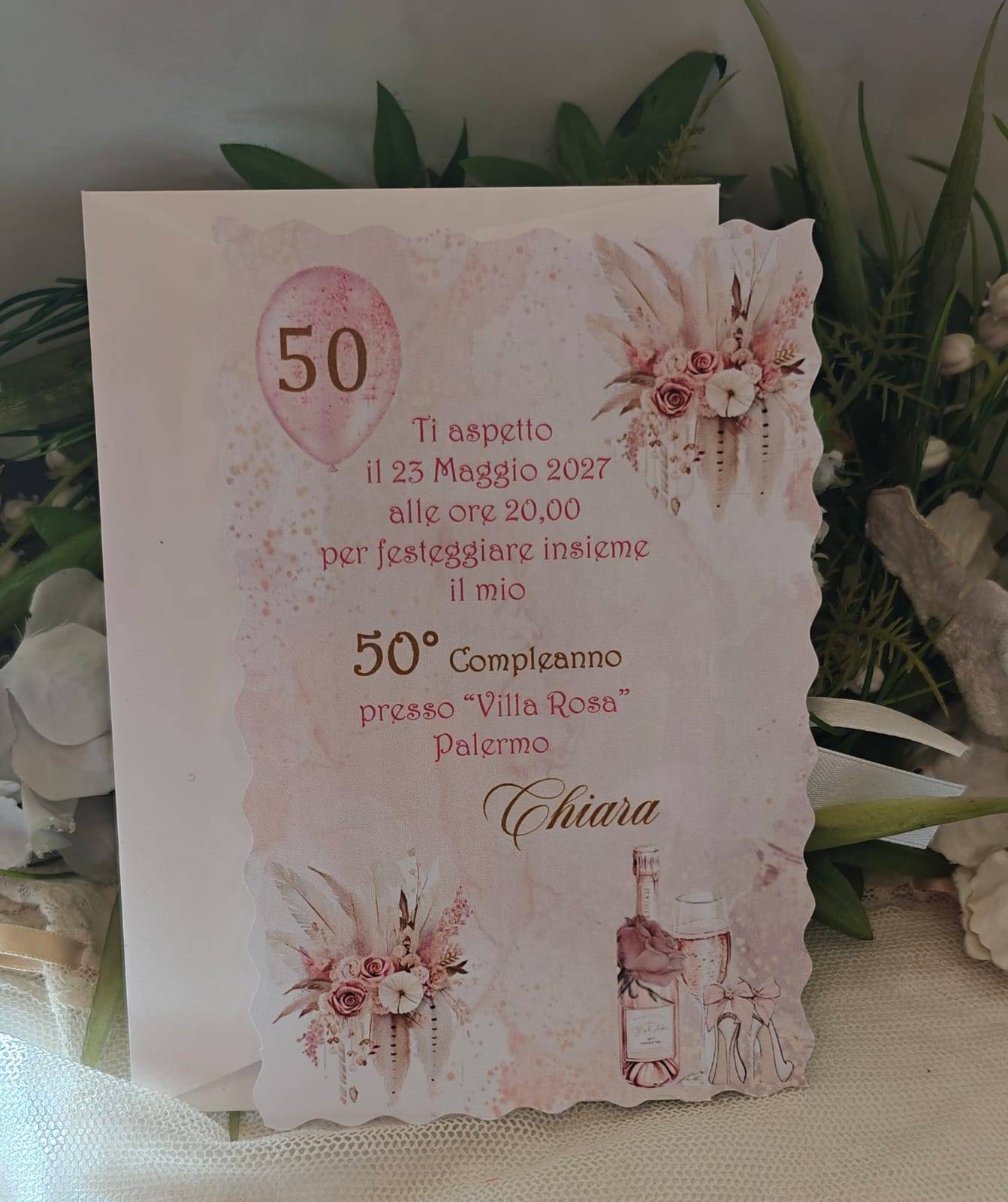Invito personalizzato Compleanno 50 anni. Realizzato in cartoncino pregiato gr. 200.
