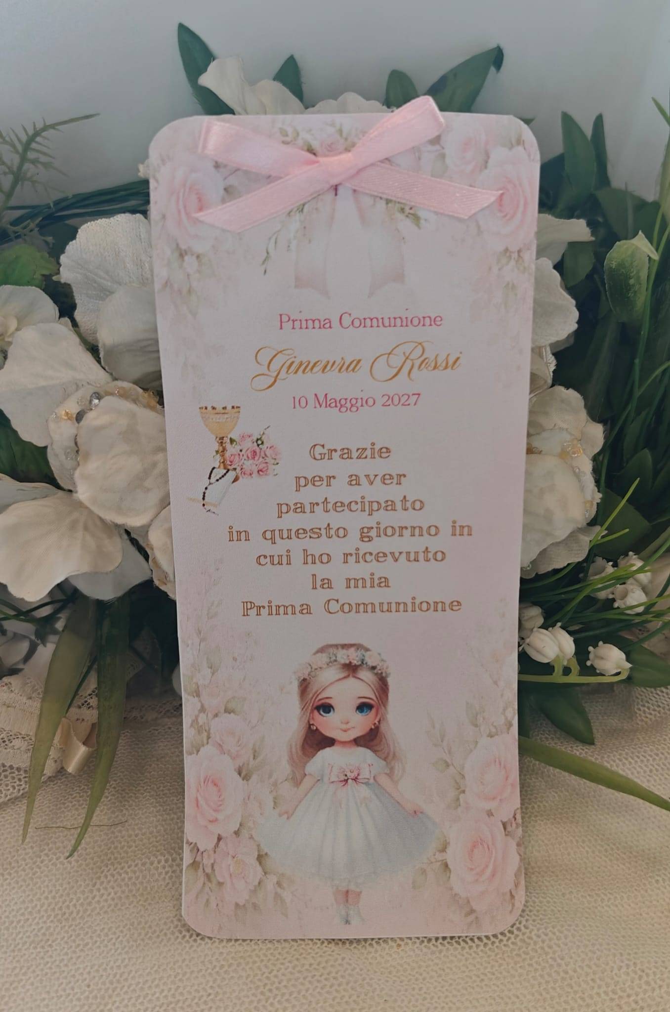 Segnalibro personalizzato Prima Comunione con pensierino da posizionare sopra il tovagliato nella location dove festeggiate le vostre ricorrenze come segnaposto si può aggiungere anche il nome degli invitati.