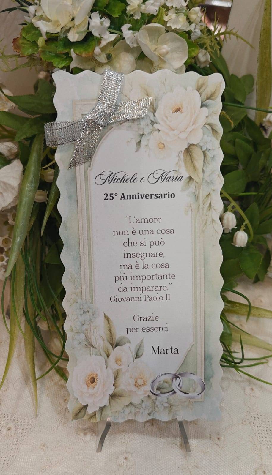 Invito Nozze d'argento realizzato a mano in cartoncino bianco misura 11,5 x 17,5 cm.