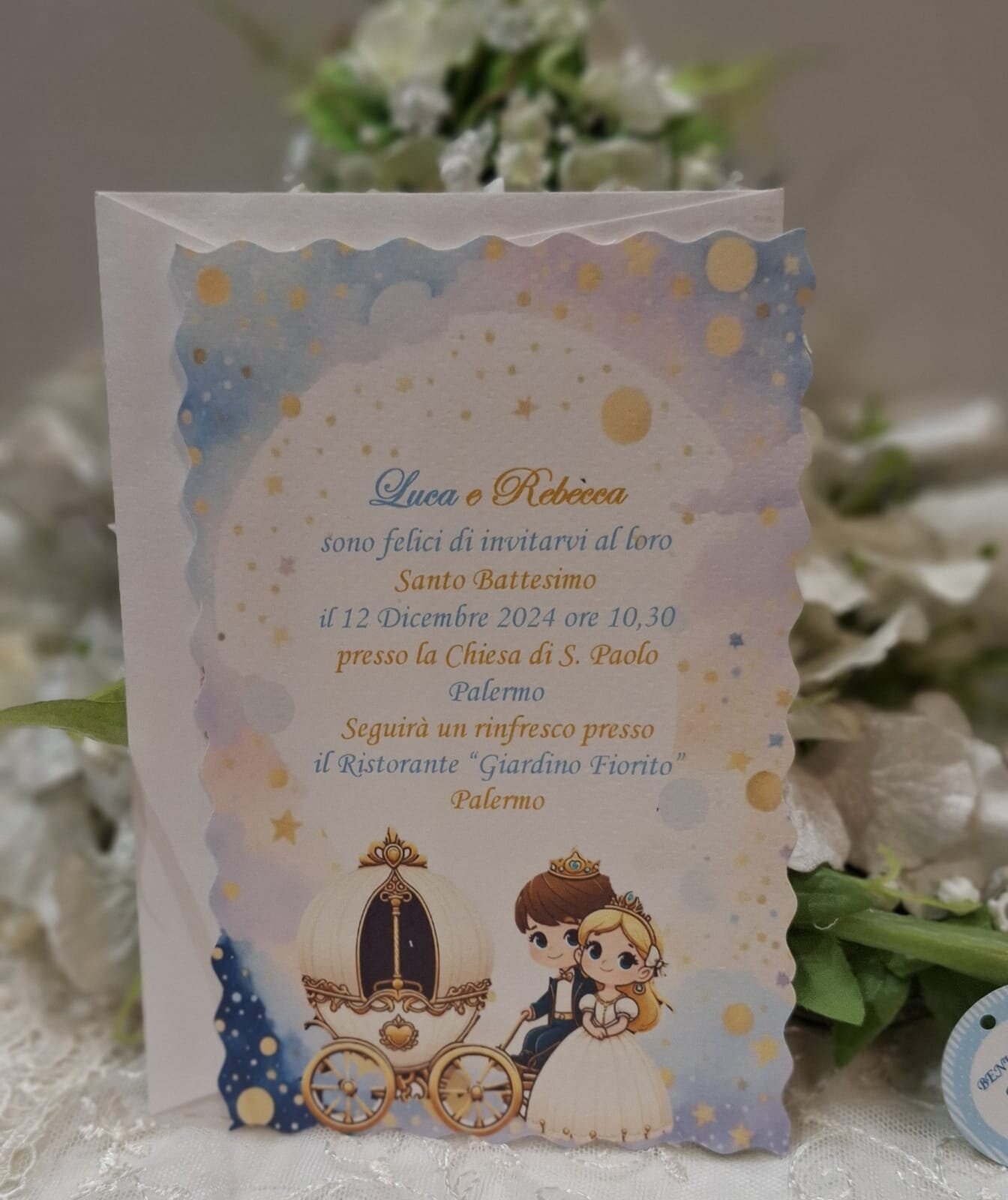 Invito Battesimo. L'invito viene realizzato su Cartoncino pregiato gr. 200, completo di busta.