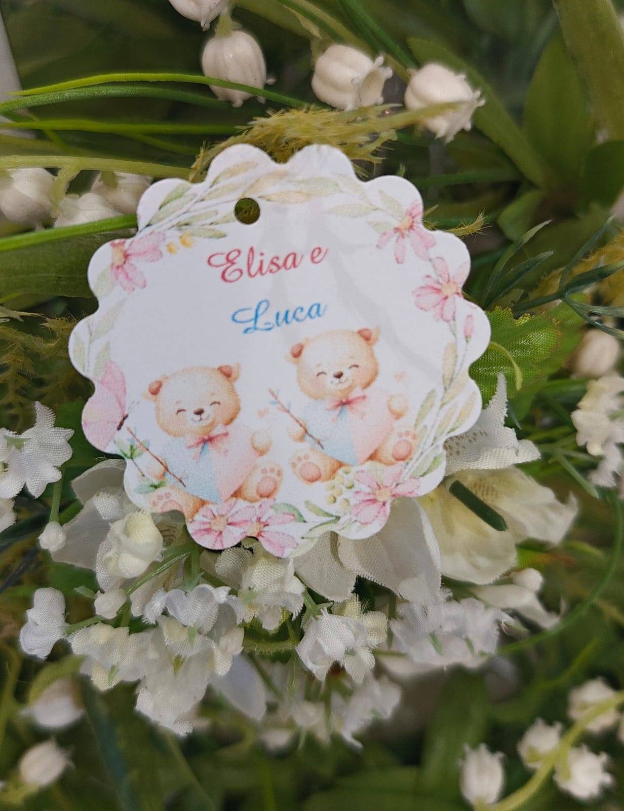 Bigliettino rotondo personalizzato per nascita da attaccare al sacchettino