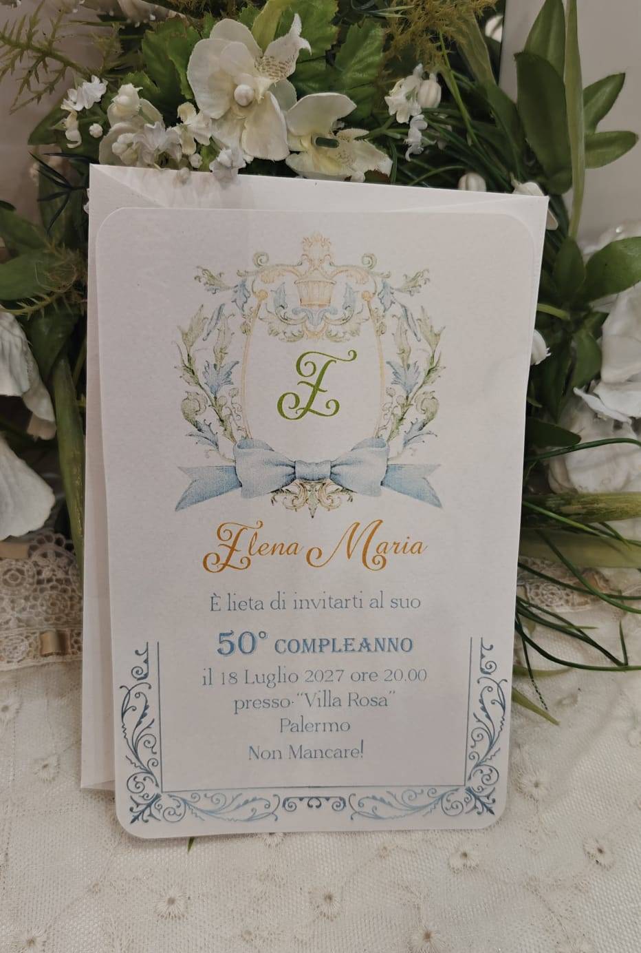 Invito personalizzato Compleanno 50 anni. Realizzato in cartoncino martellato gr. 200.