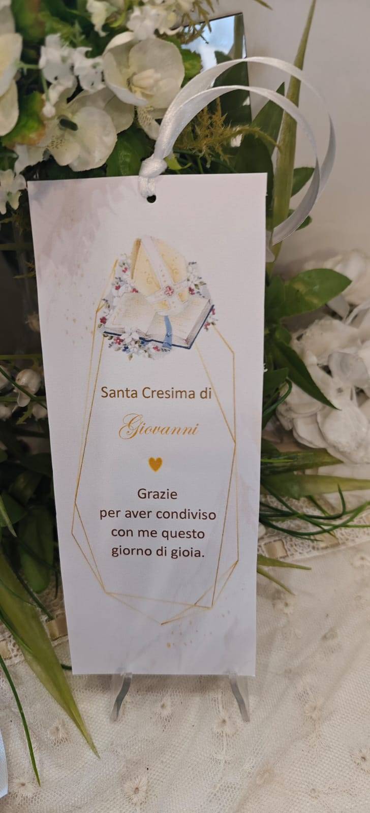 Segnalibro personalizzato Cresima con pensierino da posizionare sopra il tovagliato nella location dove festeggiate le vostre ricorrenze come segnaposto si può aggiungere anche il nome degli invitati.