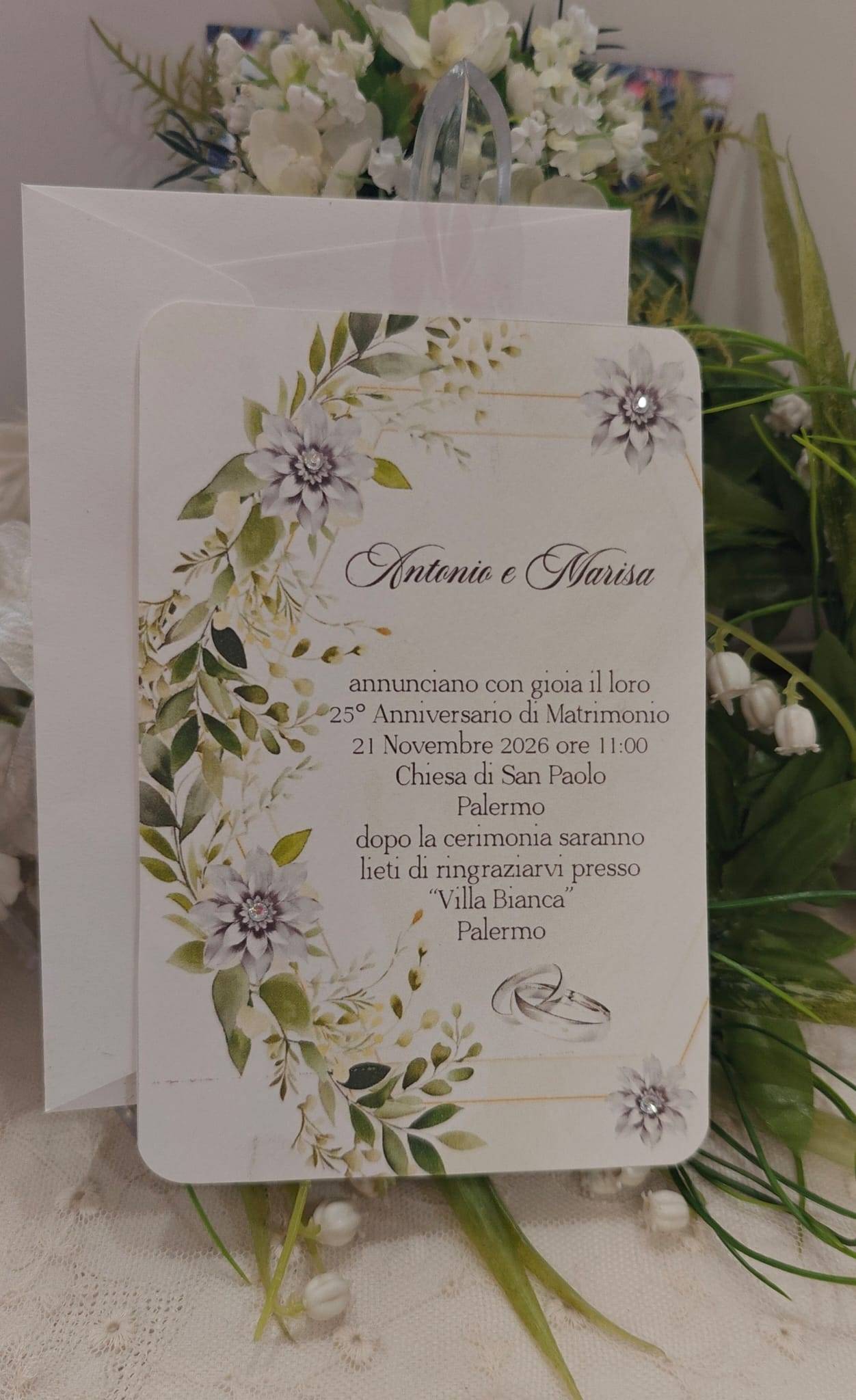 Invito Nozze d'argento realizzato a mano in cartoncino bianco misura 11,5 x 17,5 cm.