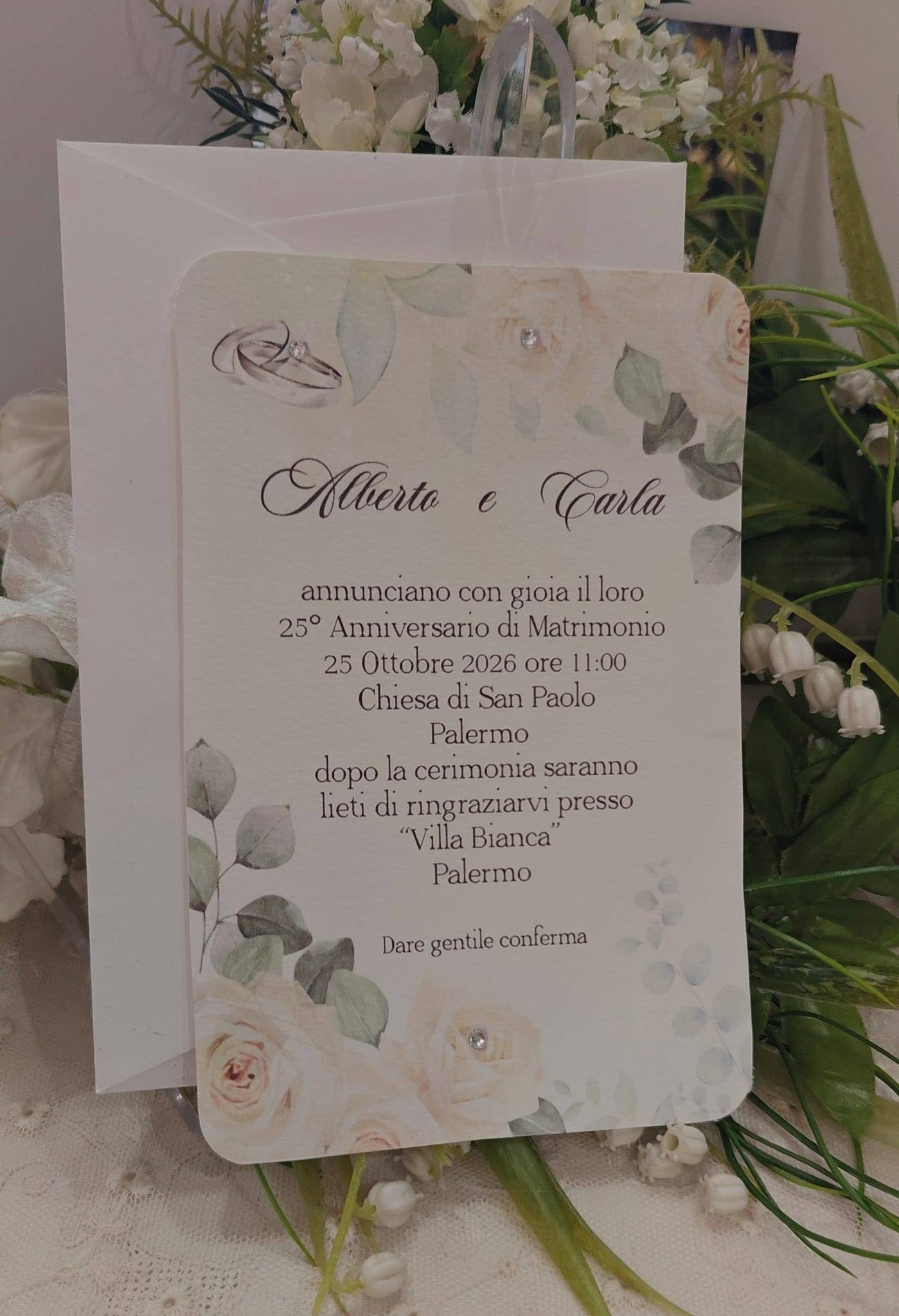 Invito Nozze d'argento realizzato a mano in cartoncino bianco misura 11,5 x 17,5 cm.