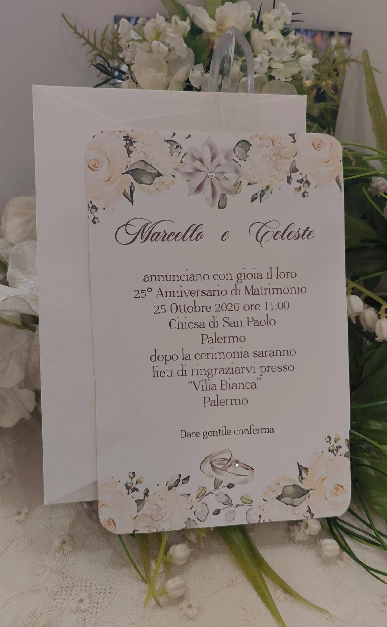 Invito Nozze d'argento realizzato a mano in cartoncino bianco misura 11,5 x 17,5 cm.