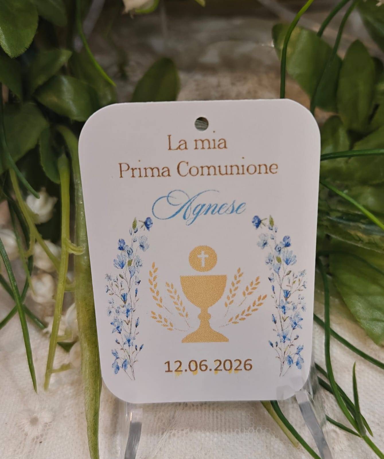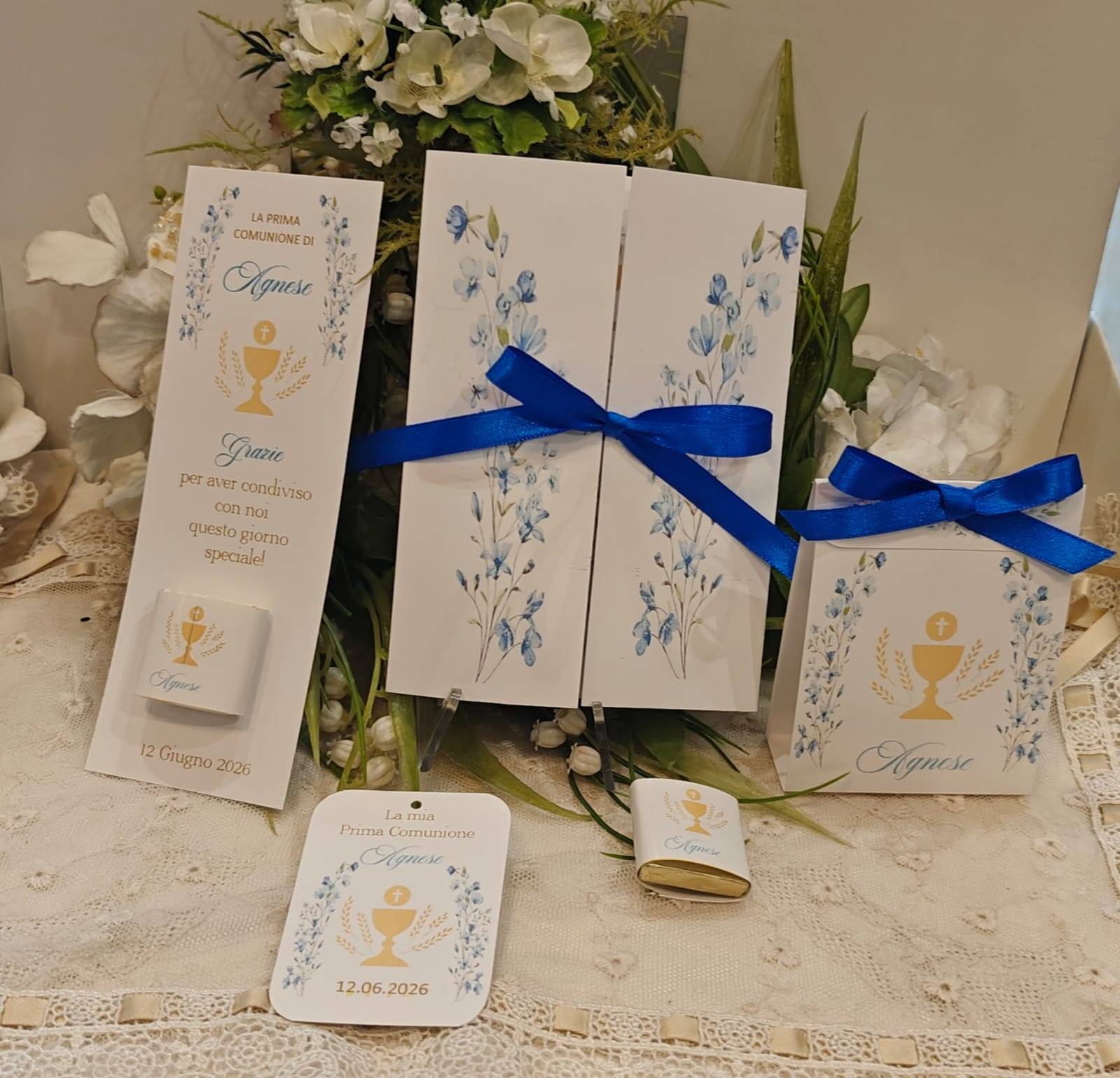 Invito Prima Comunione con fiorellini carta di zucchero in coordinato potete acquistare la scatolina dei confetti, il segnaposto con cioccolatino, il tag per la bomboniera, il segnaposto cioccolatino ecc...