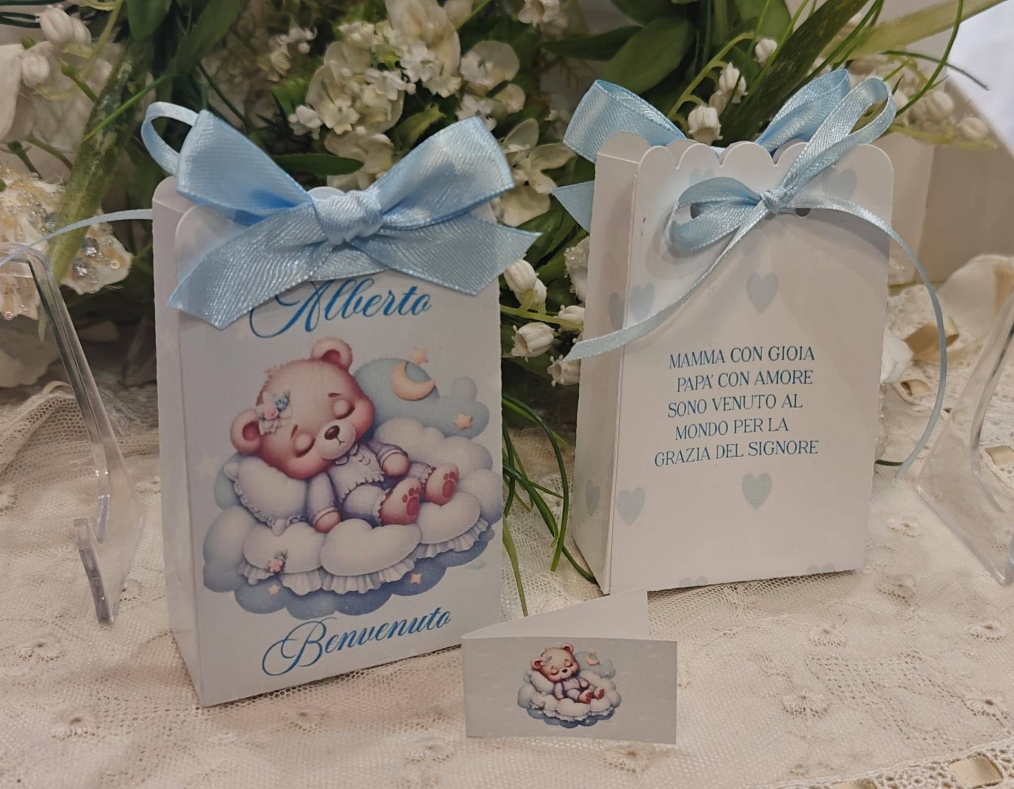 Scatolina Nascita orsetto con il nome completa di confetti bigliettino in coordinato e pensierino sul retro