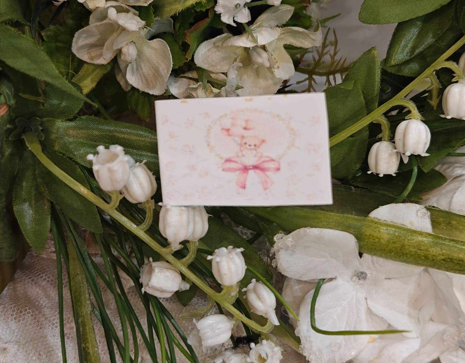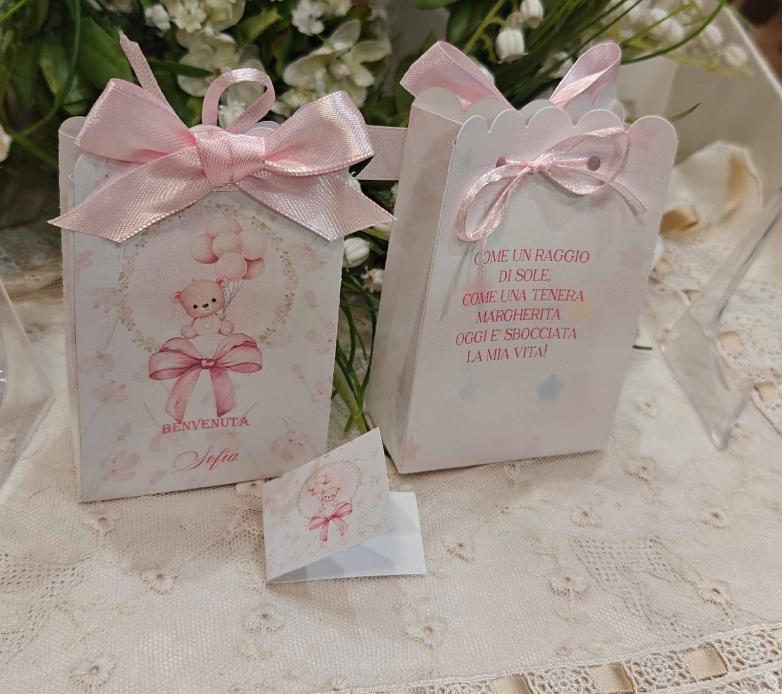 Scatolina Nascita orsetta con il nome completa di confetti bigliettino in coordinato e pensierino sul retro