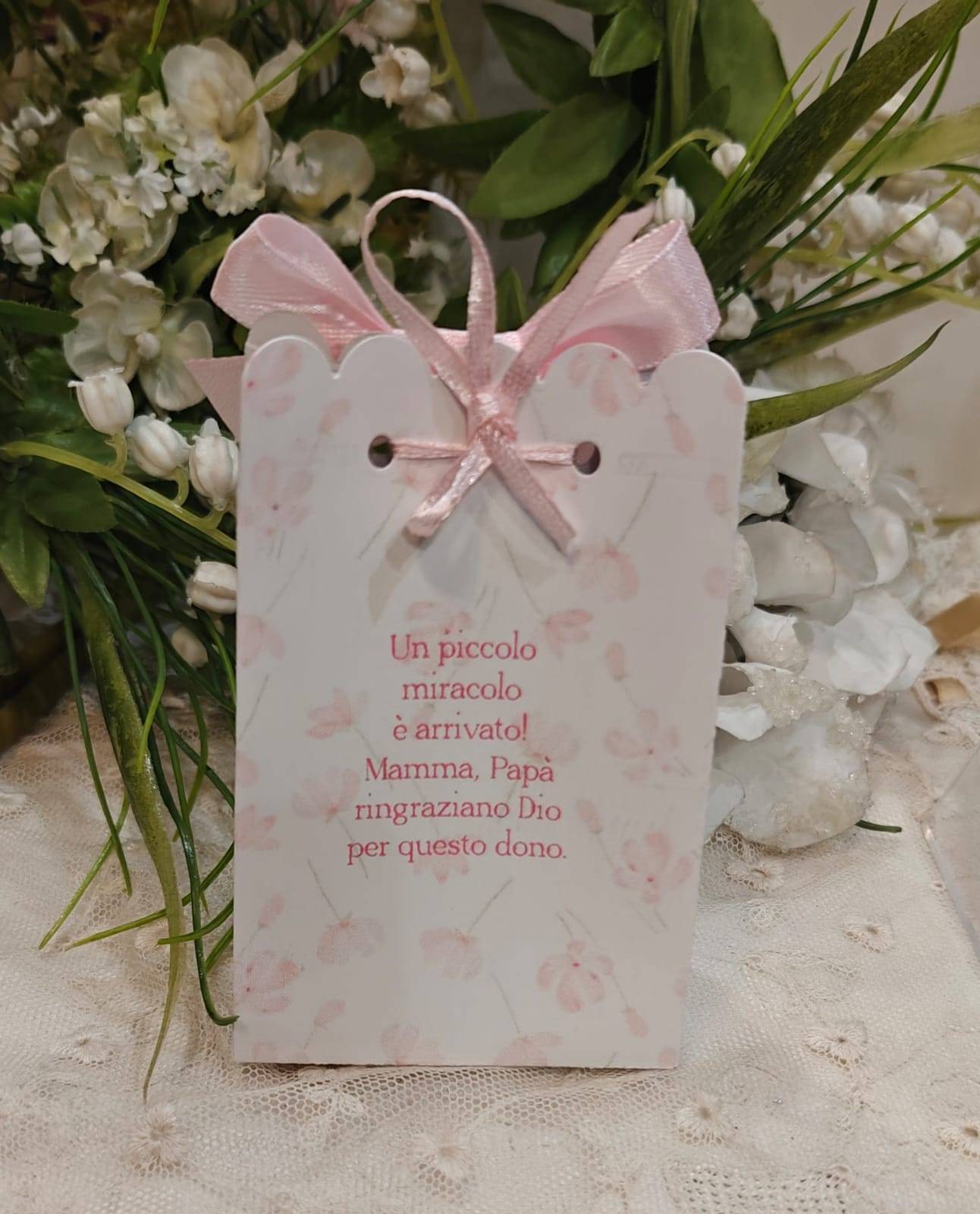 confezionata con confetti mandorla o cioccolato e biglietto incluso in coordinato.
