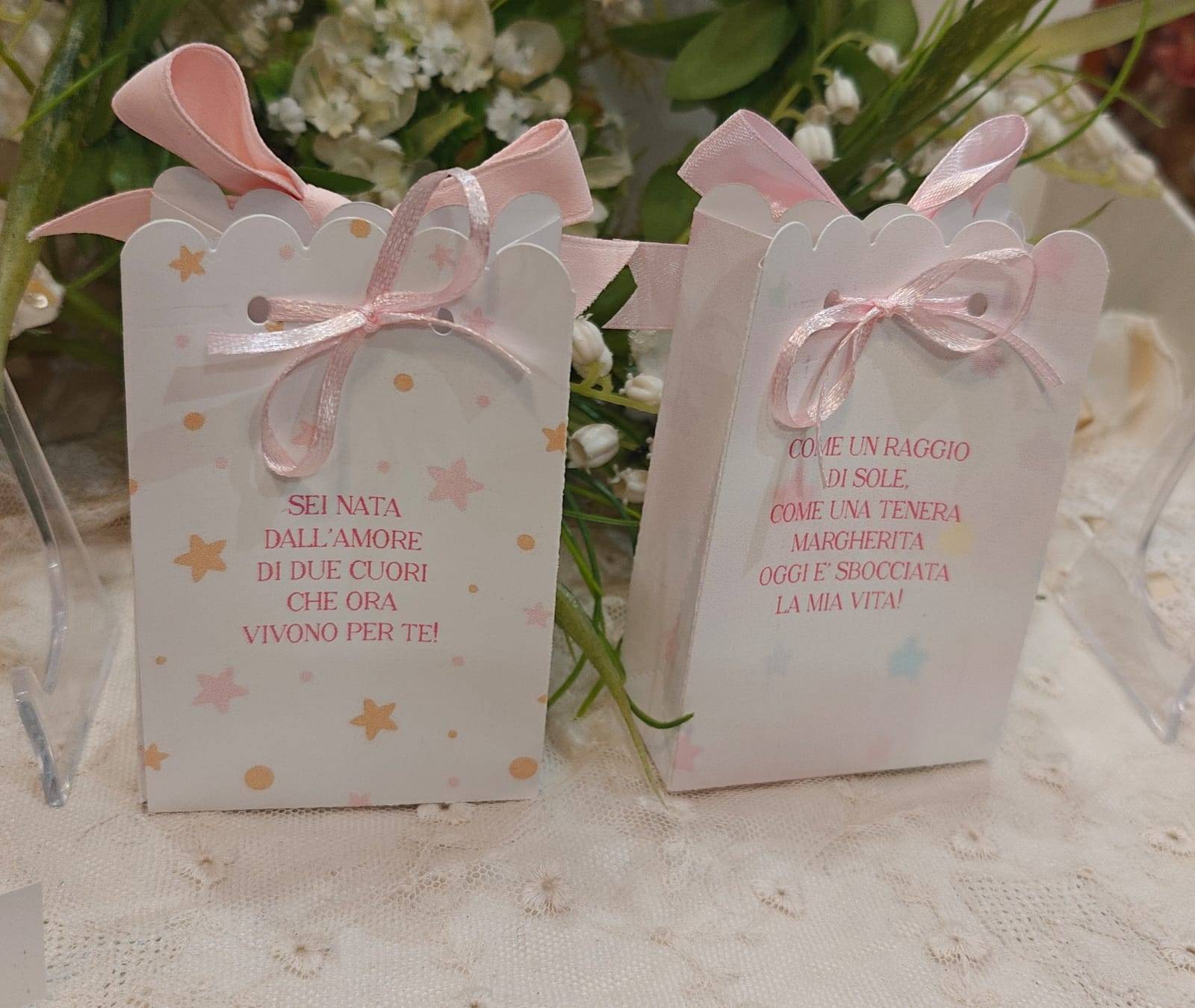confezionata con confetti mandorla o cioccolato e biglietto incluso in coordinato.