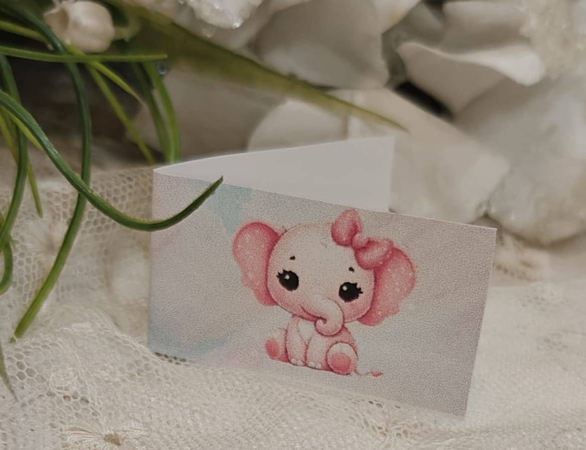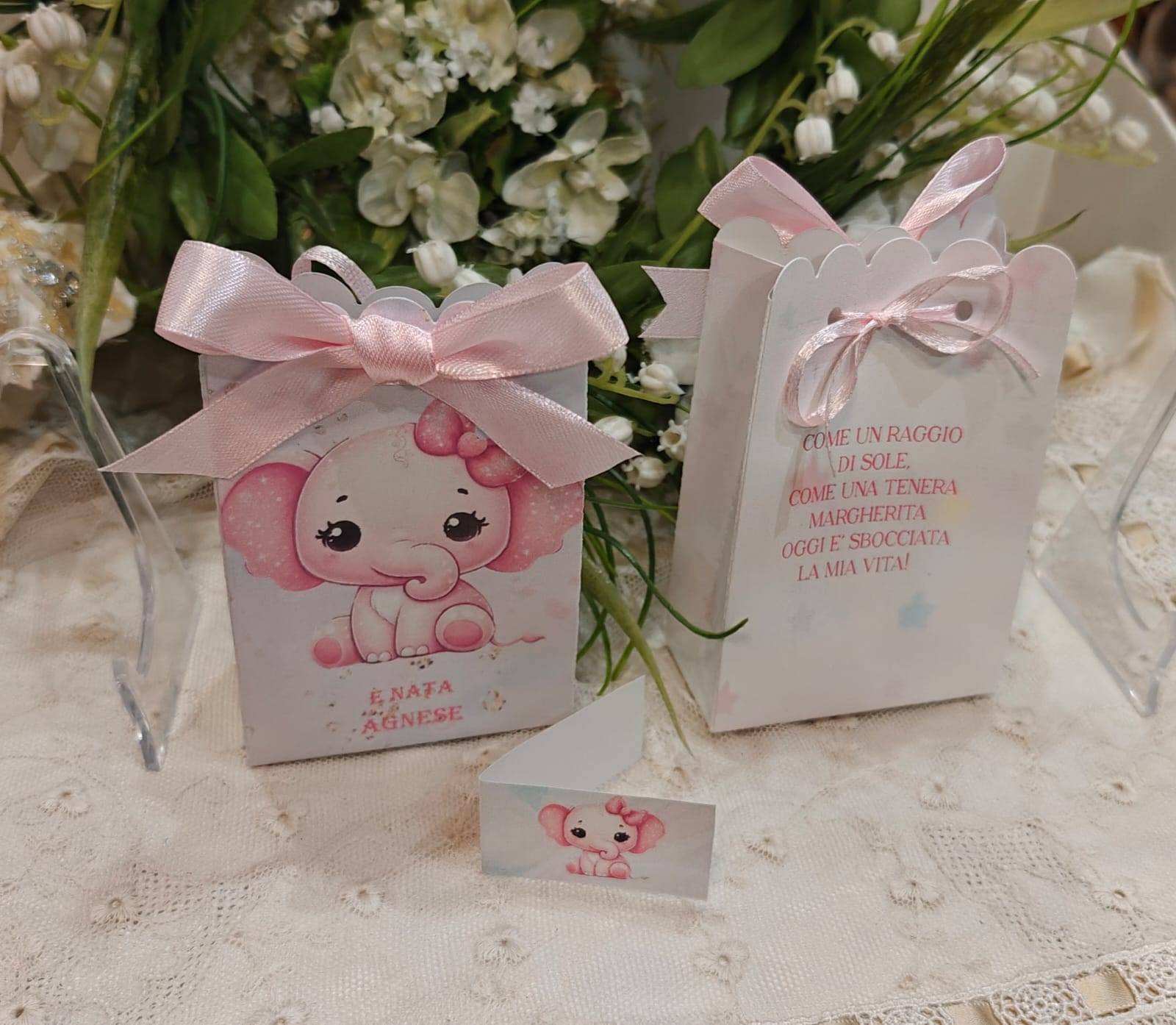 Scatolina Nascita Elefante rosa con il nome completa di confetti bigliettino in coordinato e pensierino sul retro