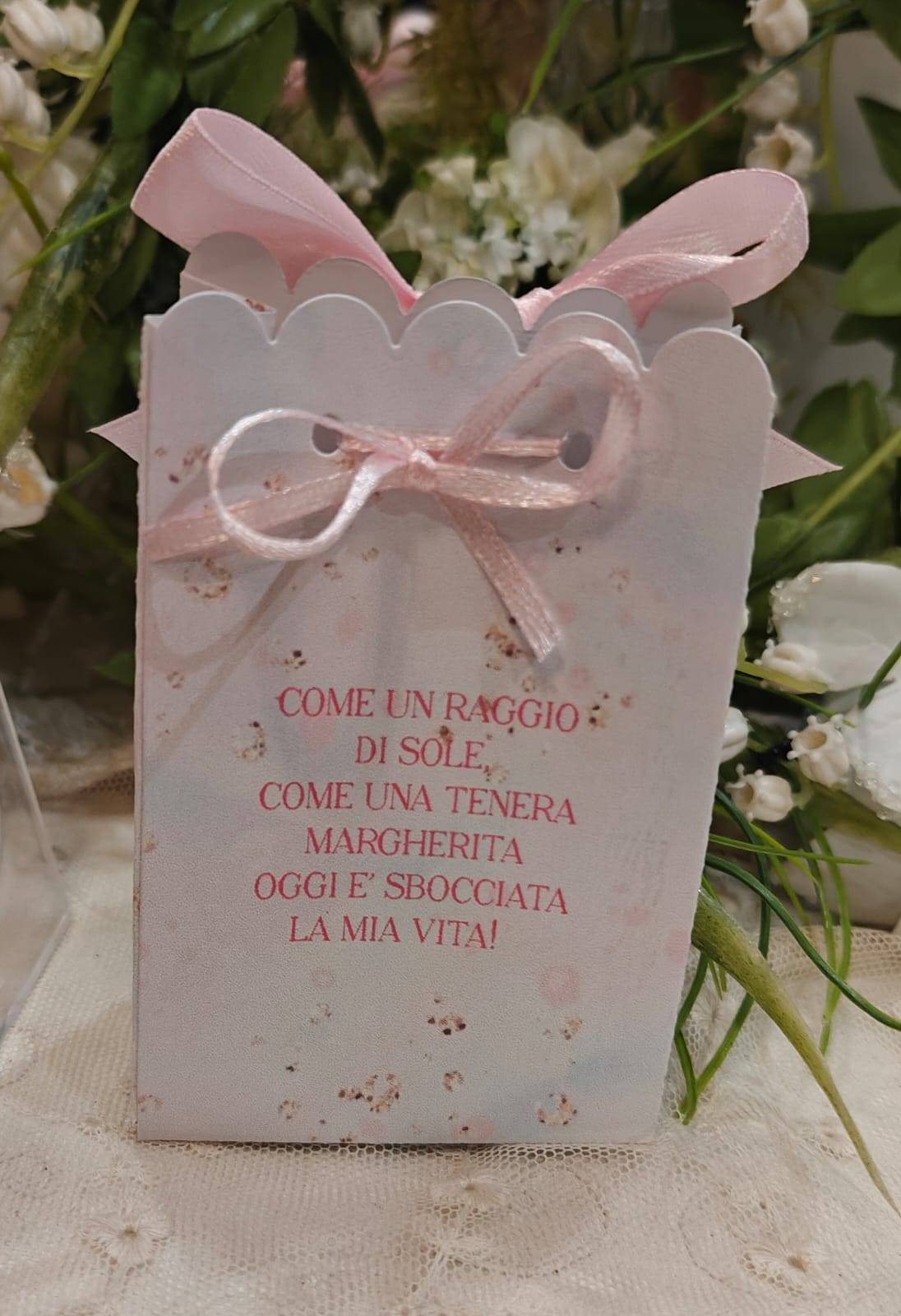confezionata con confetti mandorla o cioccolato e biglietto incluso in coordinato.
