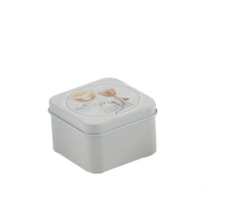 Scatolina in latta con calice Prima Comunione completo di confetti cm. 6 x 6 x 4 con bigliettino in coordinato