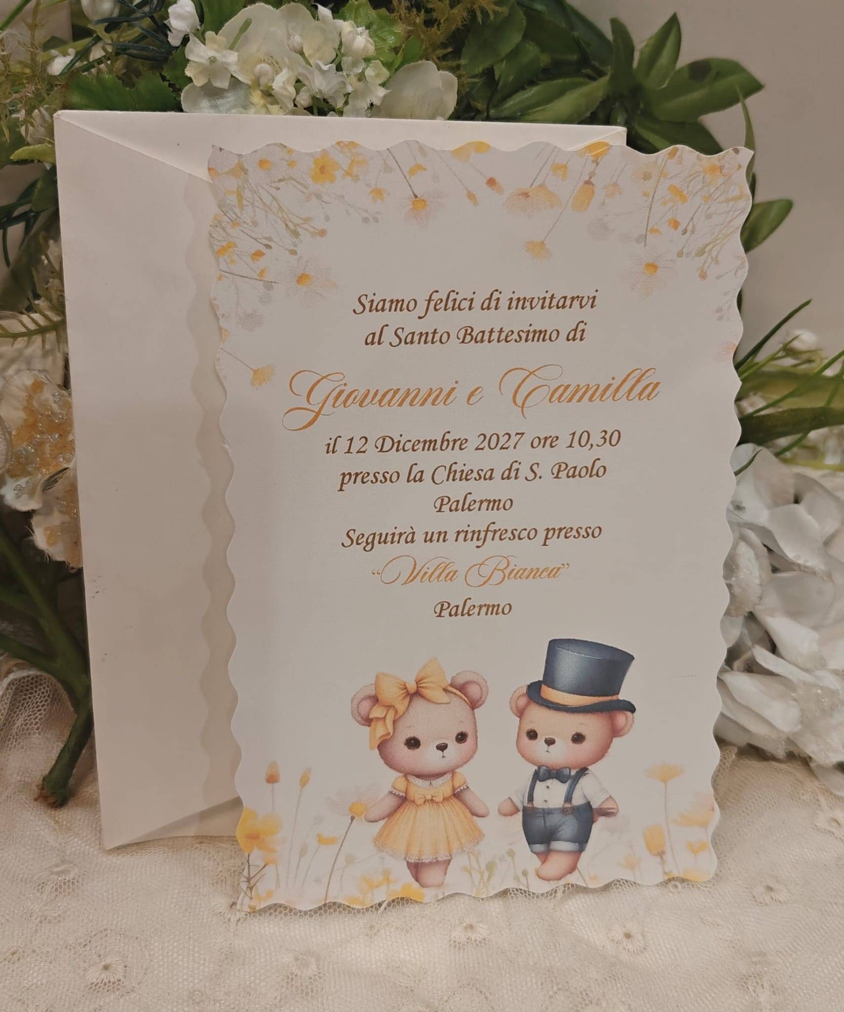 Invito Battesimo. L'invito viene realizzato su Cartoncino pregiato LUCIDO gr. 200, completo di busta.
