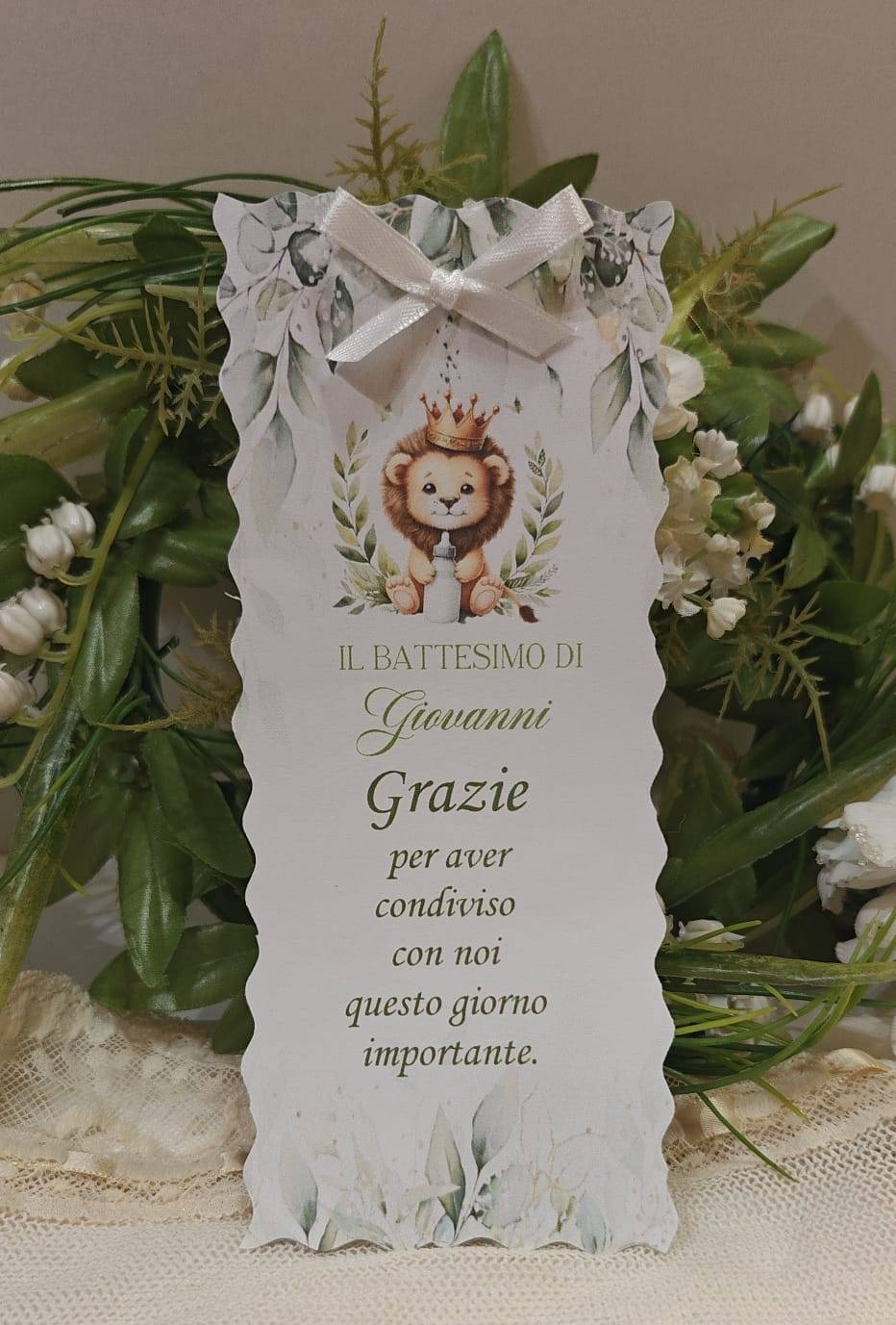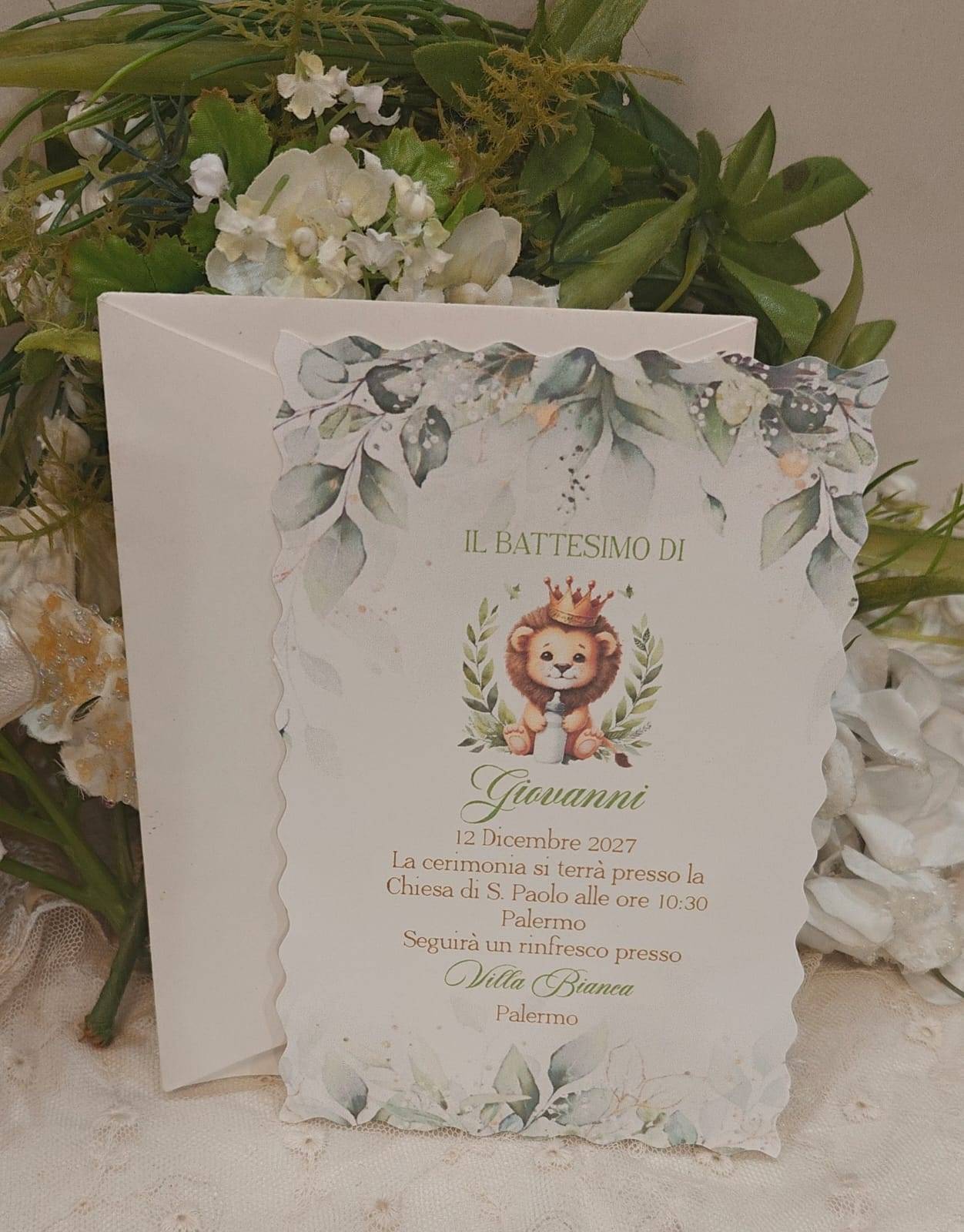 Invito Battesimo Leoncino con corona completo di busta