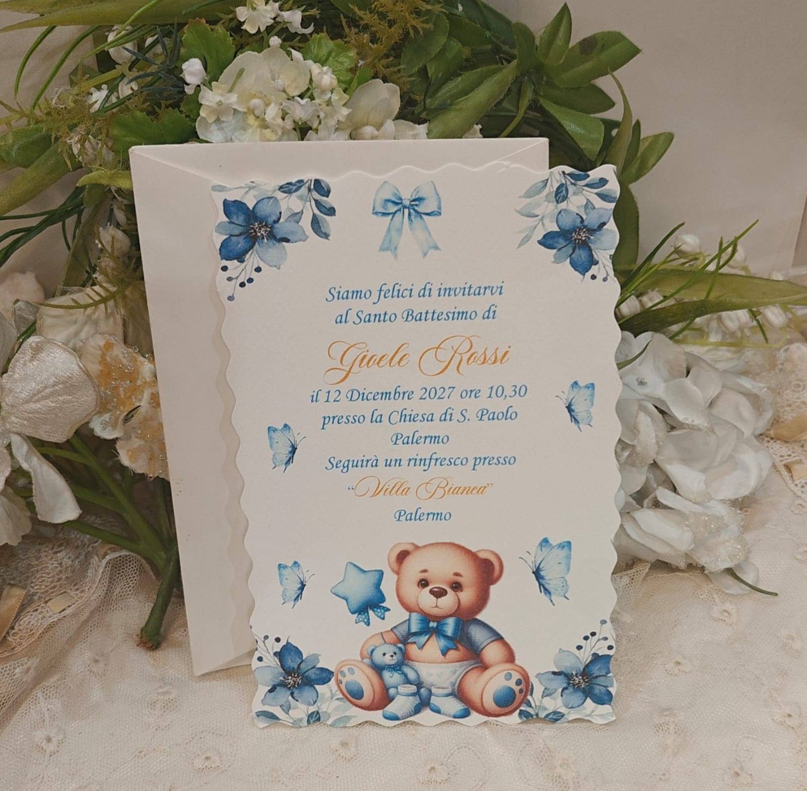 Invito Battesimo. L'invito viene realizzato su Cartoncino pregiato gr. 200, completo di busta.