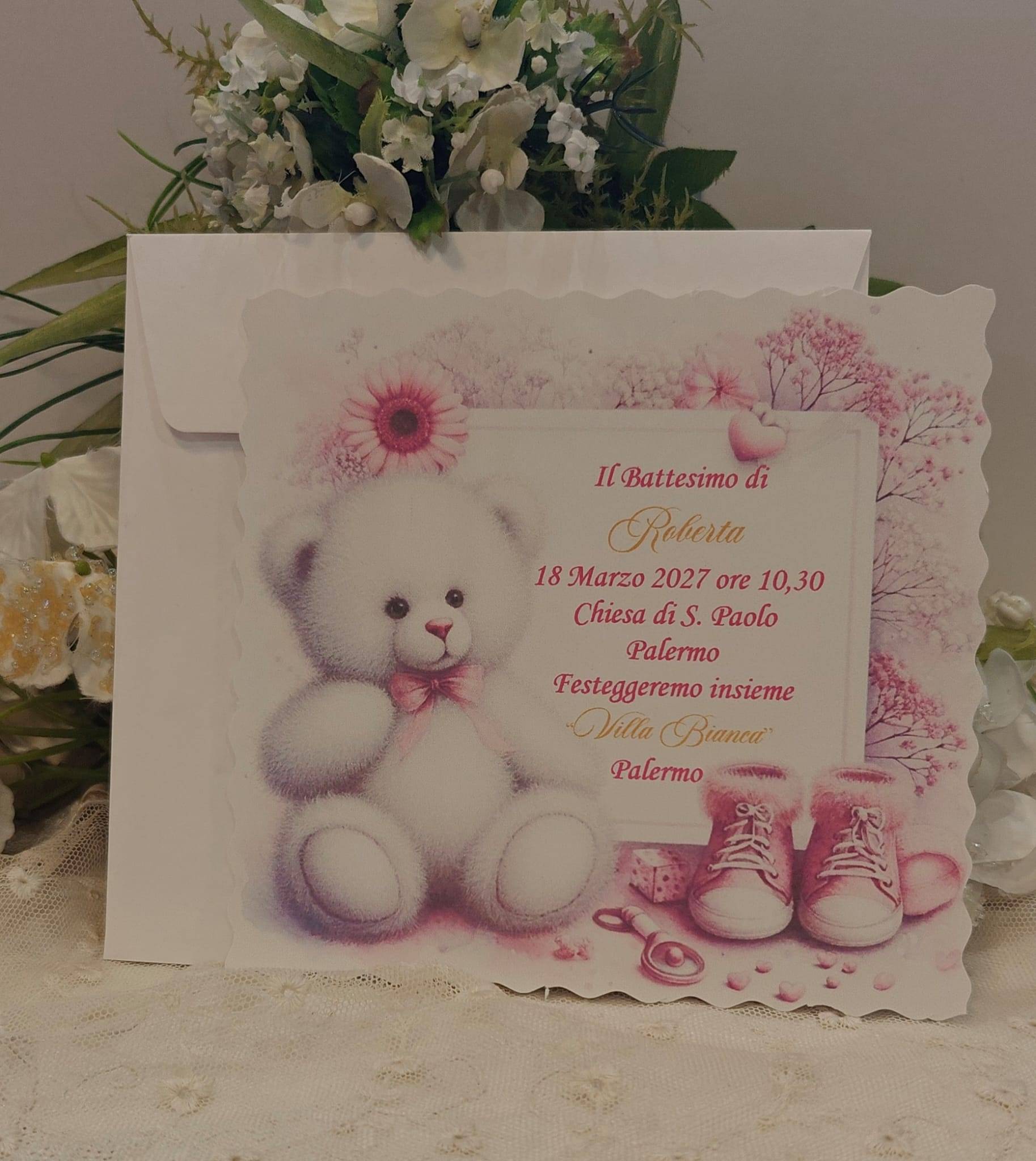 Invito Battesimo ORSETTO ROSA completo di busta 16 x 16