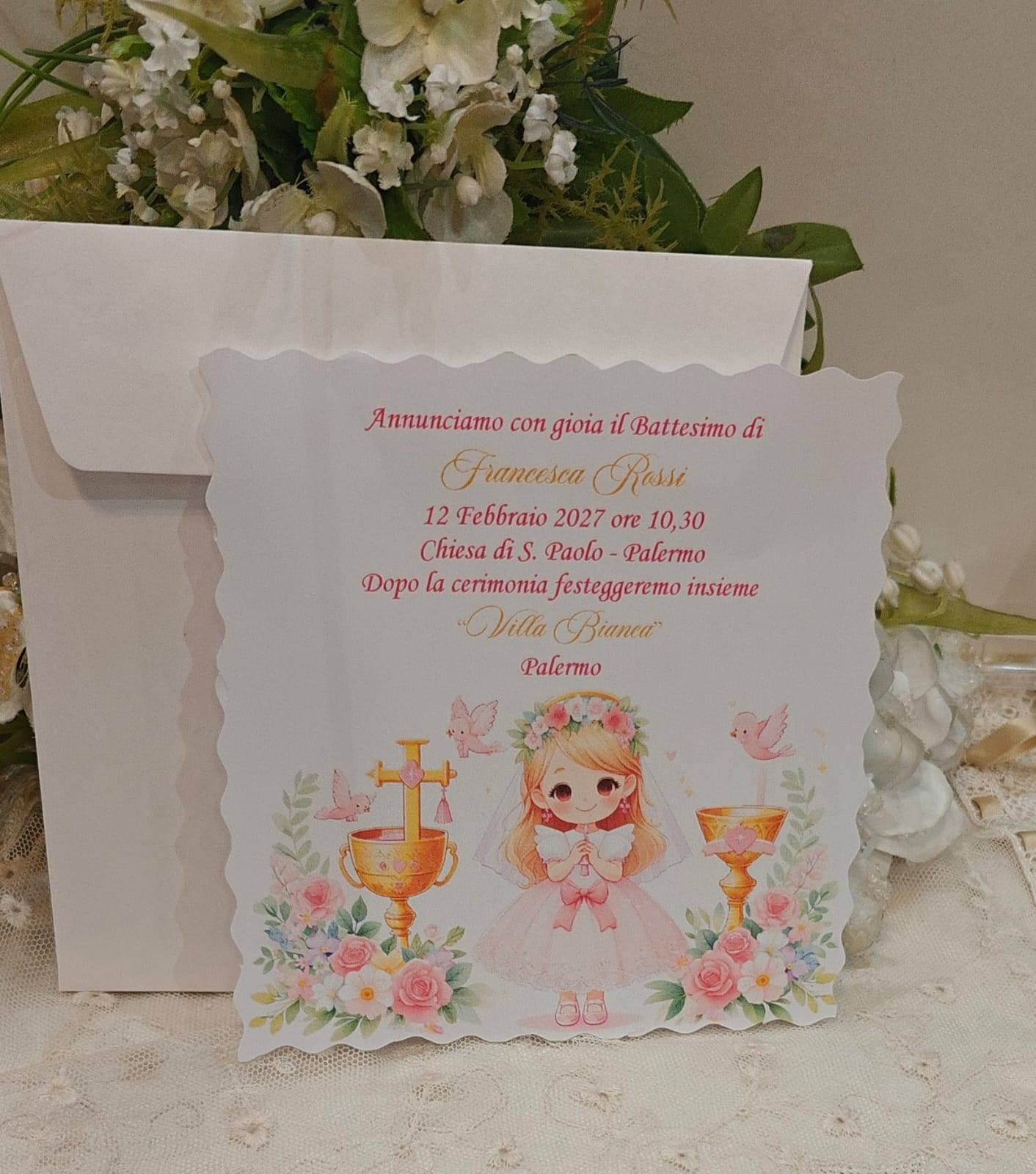 Invito Battesimo. L'invito viene realizzato su Cartoncino pregiato LUCIDO gr. 200, completo di busta.