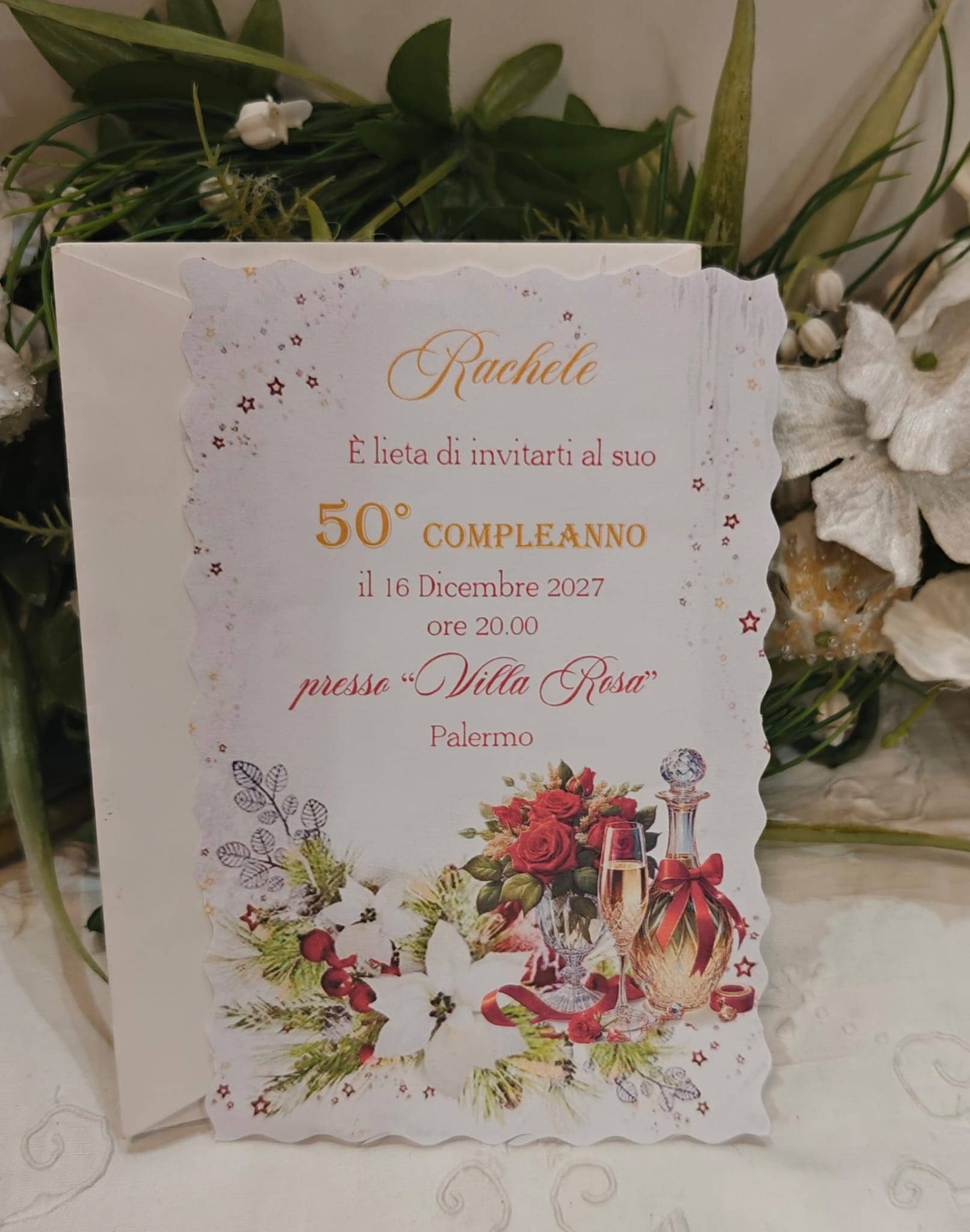 Invito 50 Anni donna con busta NATALIZIO