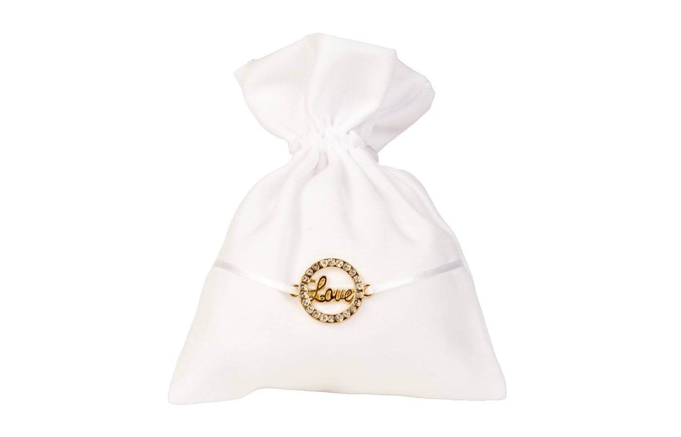 Sacchetto matrimonio bianco con applicazione oro love cm. 10 x 12 h