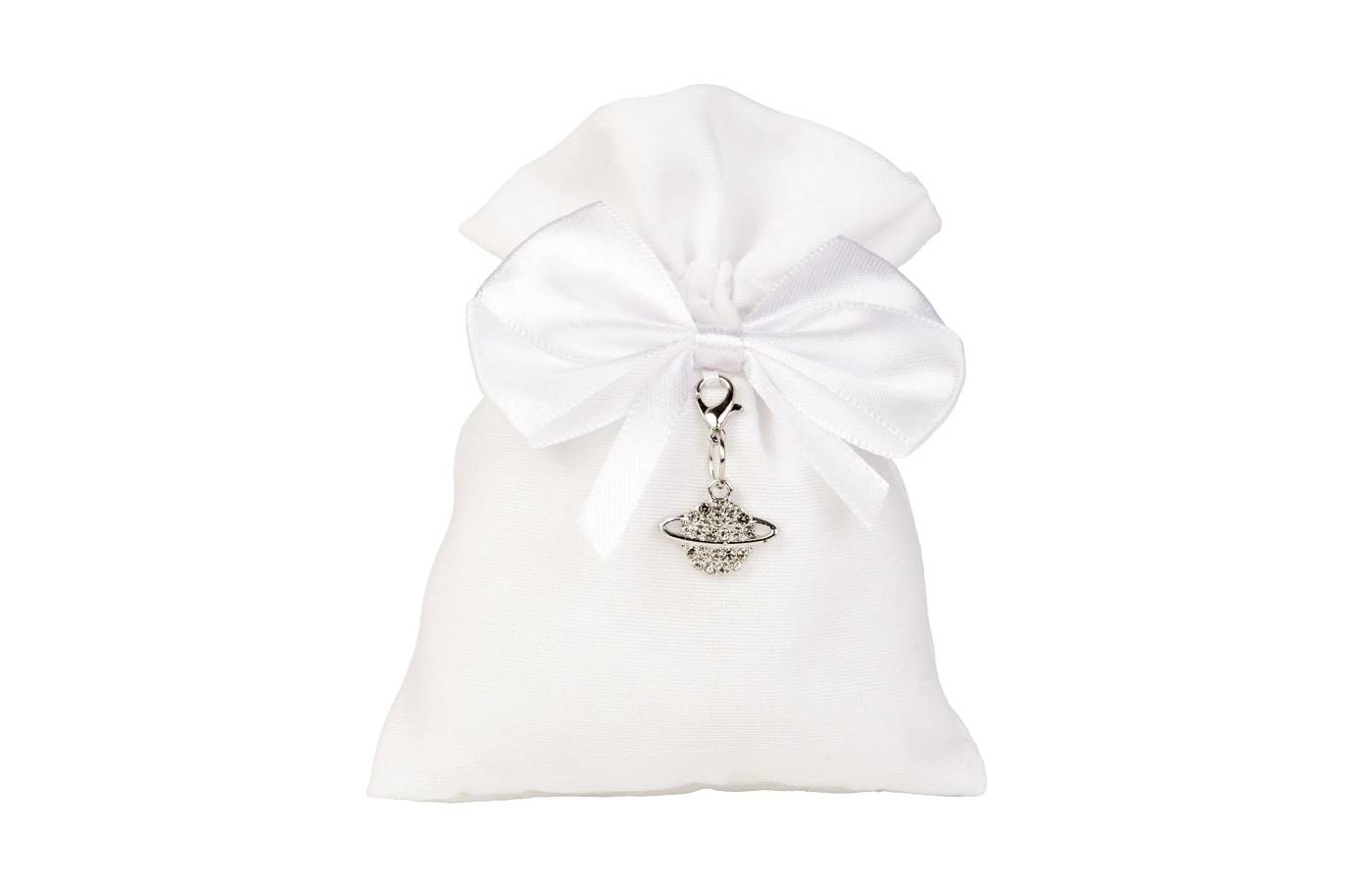 Sacchetto matrimonio bianco con applicazione silver mondo cm. 10 x 12 h