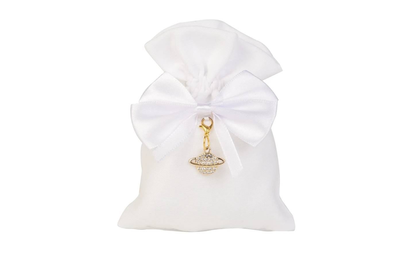 Sacchetto matrimonio bianco con applicazione oro mondo cm. 10 x 12 h
