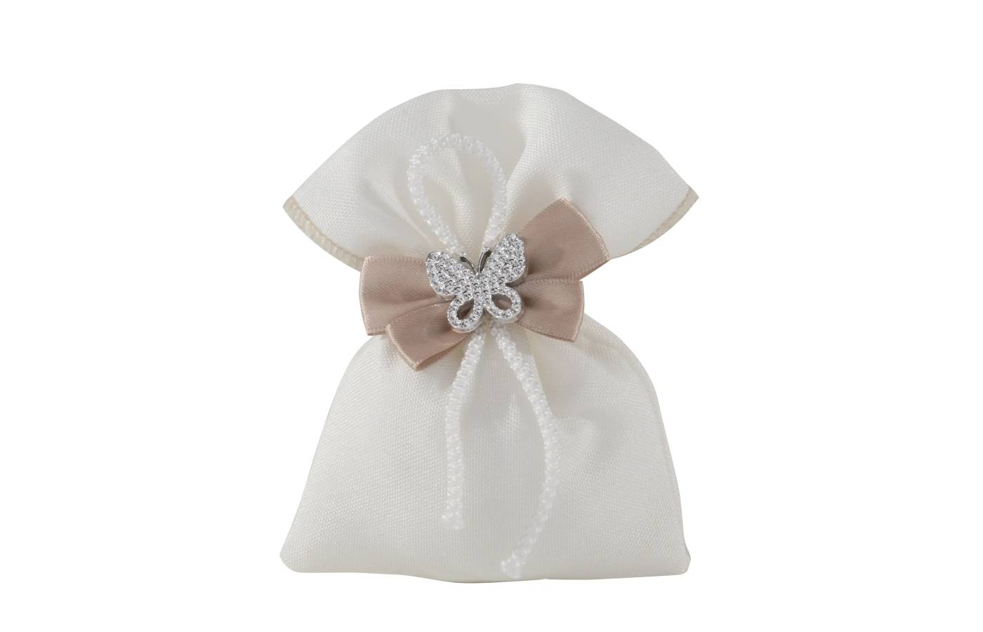Sacchetto matrimonio con applicazione farfalla silver completo di confetti cm 10 x 12