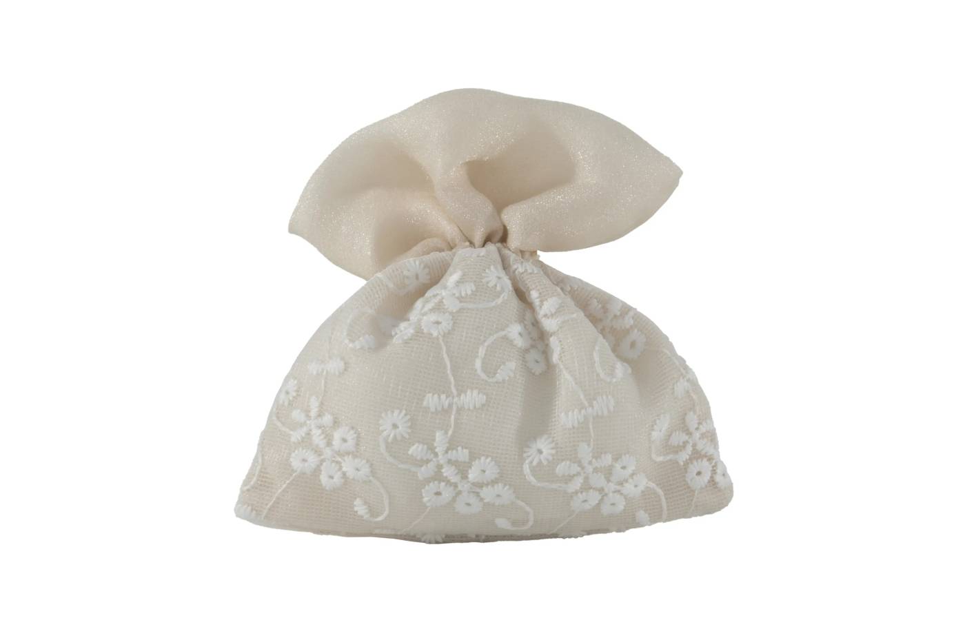 Sacchetto matrimonio ricamato beige completo di confetti cm 10 x 12