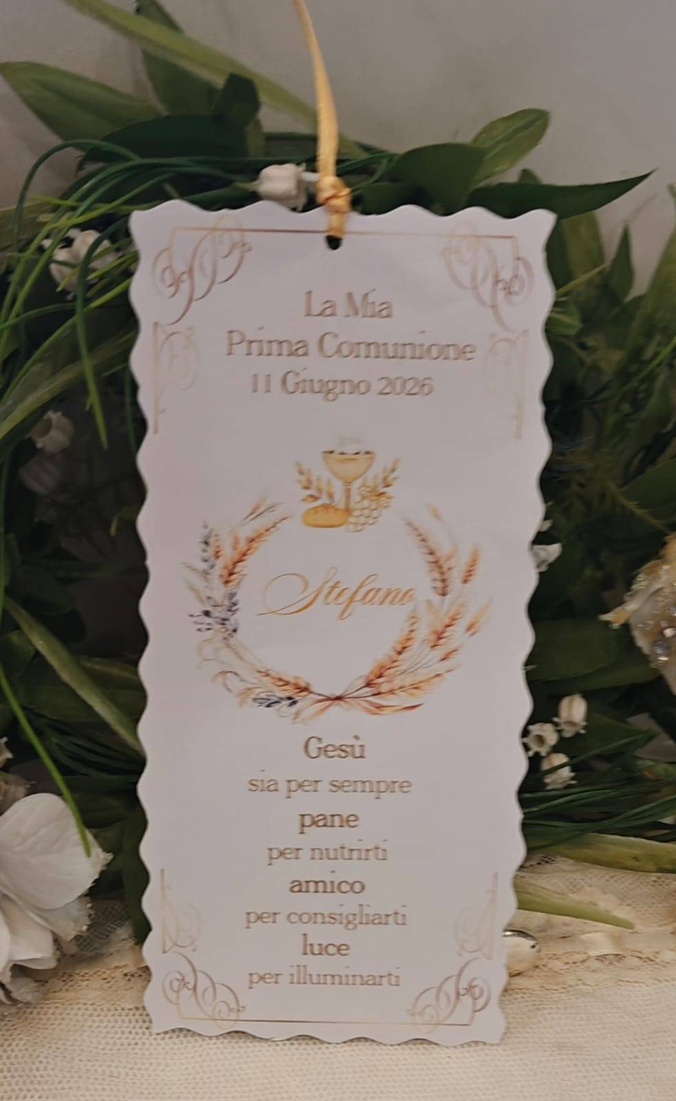Segnalibro personalizzato Prima Comunione con pensierino da posizionare sopra il tovagliato nella location dove festeggiate le vostre ricorrenze come segnaposto si può aggiungere anche il nome degli invitati.