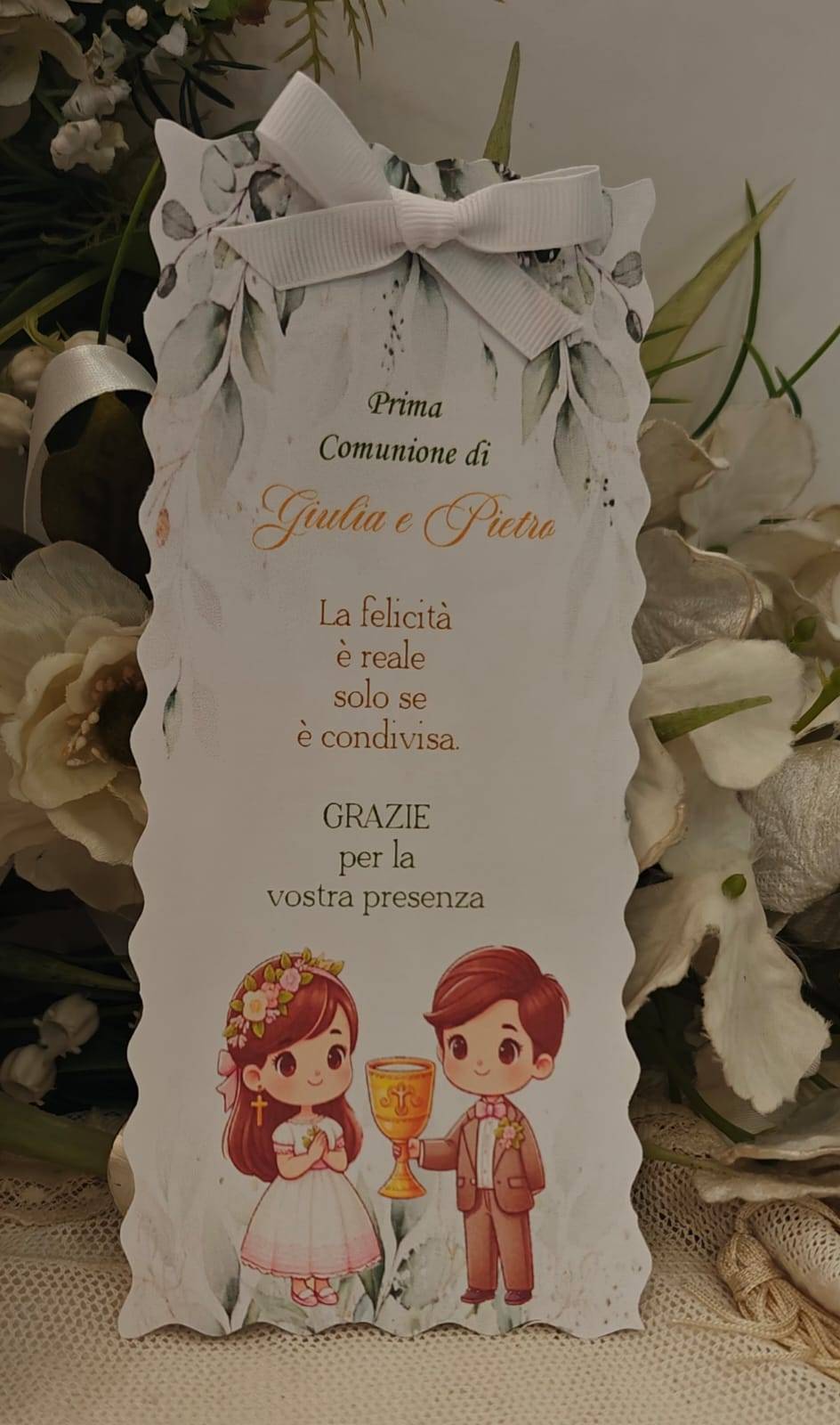 Segnalibro personalizzato Prima Comunione con pensierino da posizionare sopra il tovagliato nella location dove festeggiate le vostre ricorrenze come segnaposto si può aggiungere anche il nome degli invitati.