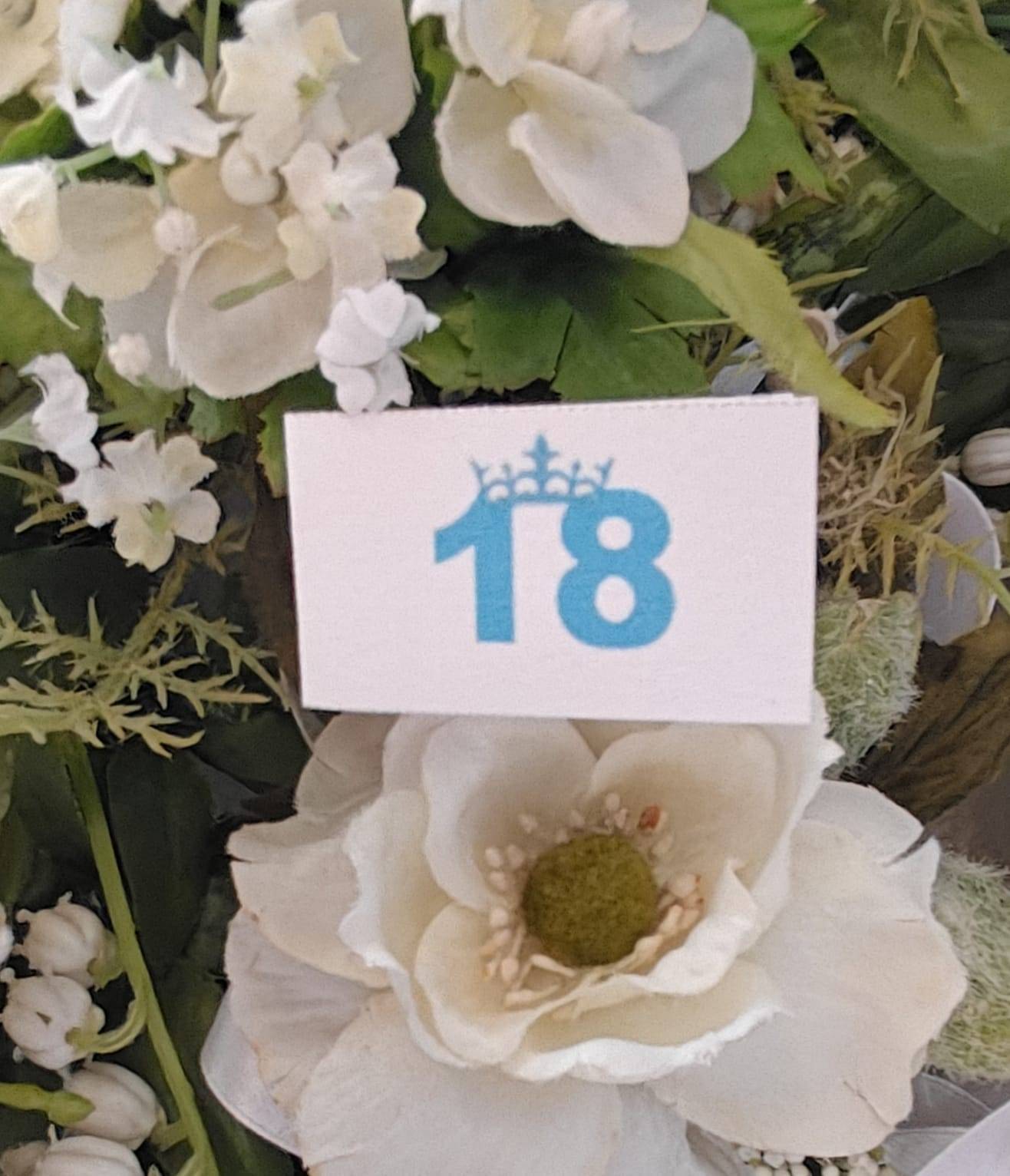 Bigliettino 18 anni in coordinato all'invito, segna tavolo, cono confettata, menù, scatolina misura 5 ×3 cm, realizzato in cartoncino pregiato gr.250.