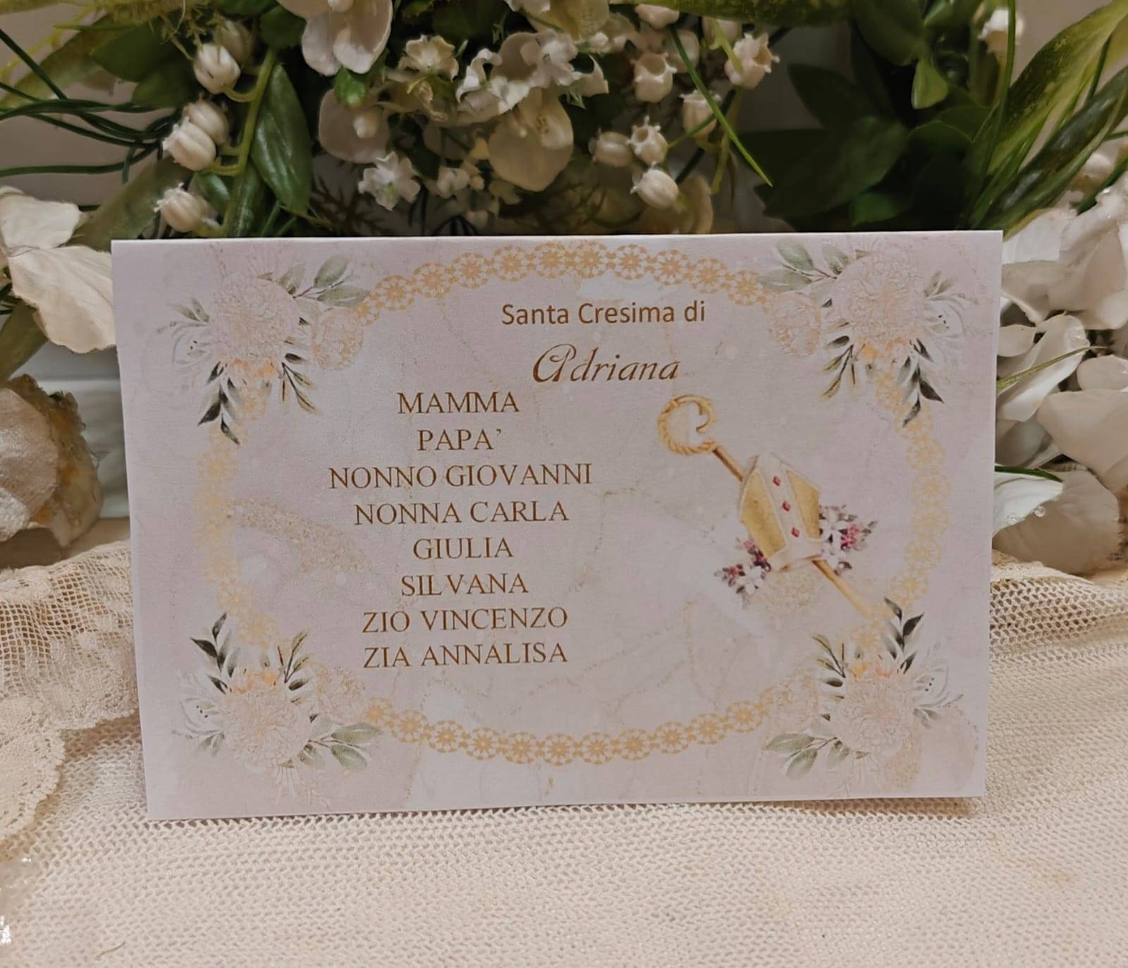 Segnatavolo Santa Cresima con i nomi degli invitati piegato cm. 20 x 14