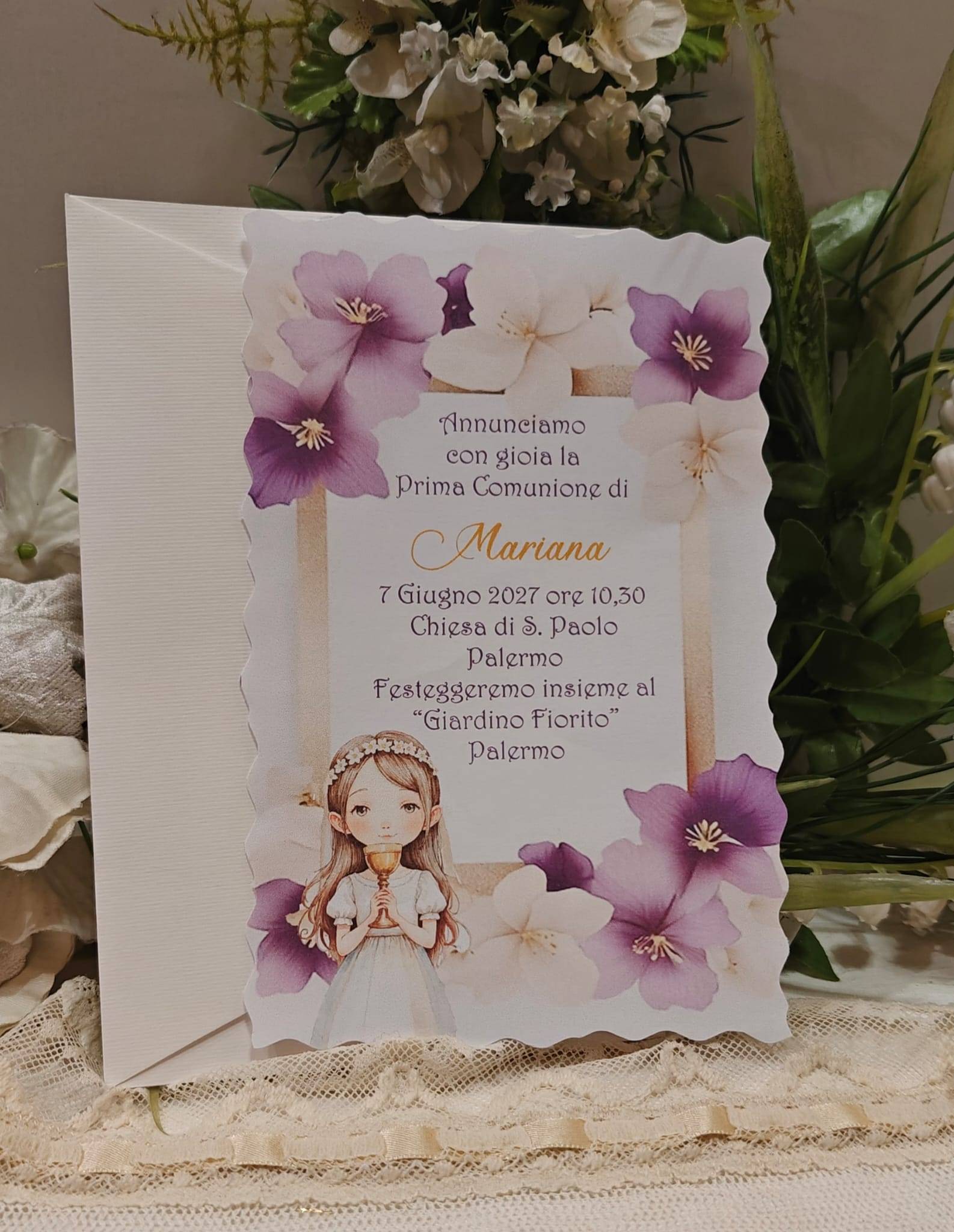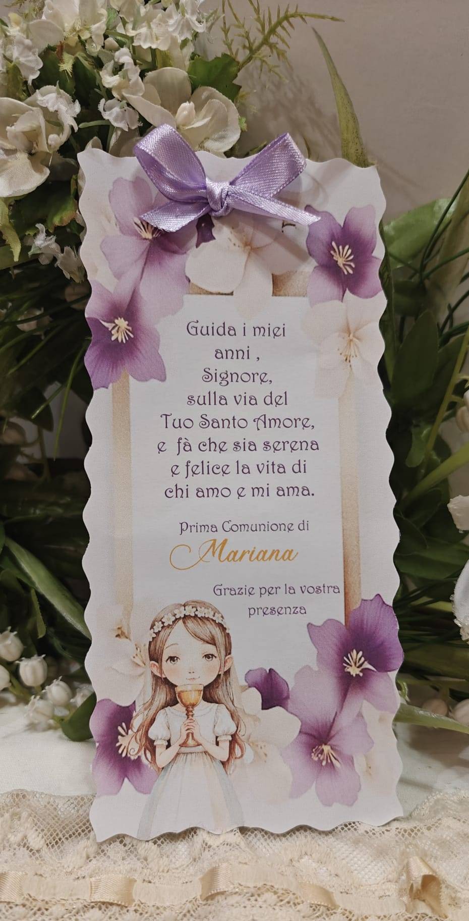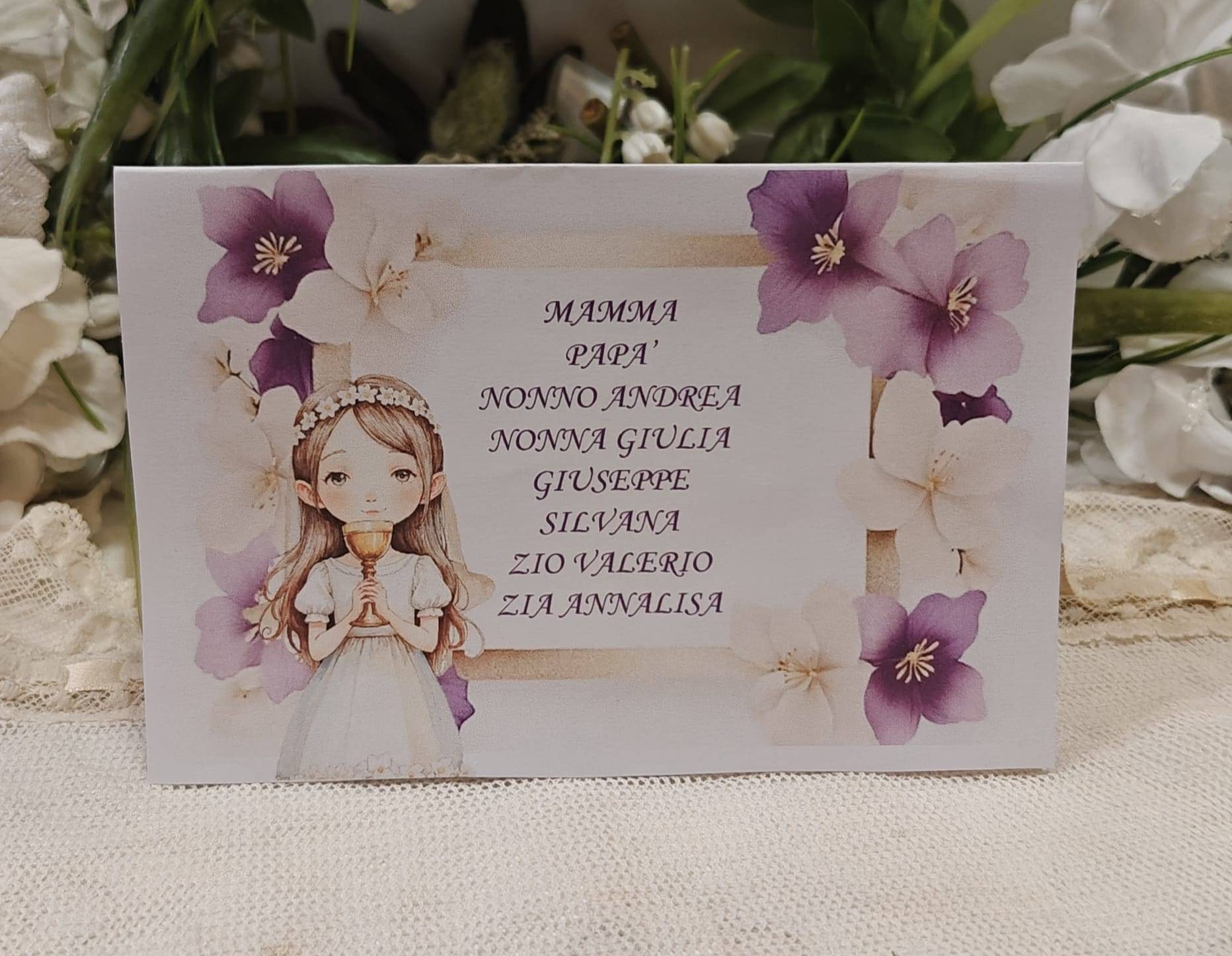 Segnatavolo Prima Comunione con i nomi degli invitati piegato cm. 20 x 14