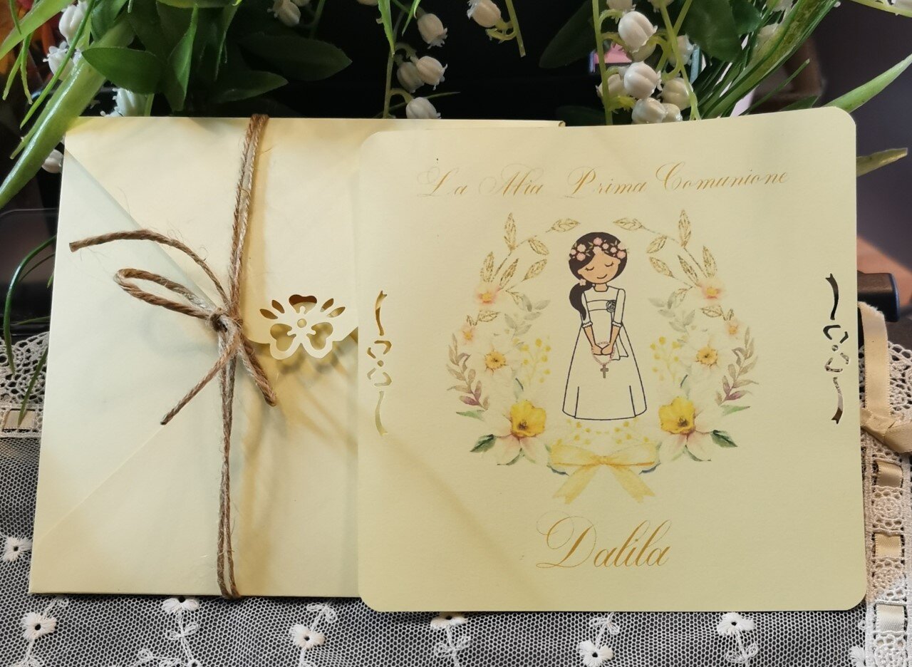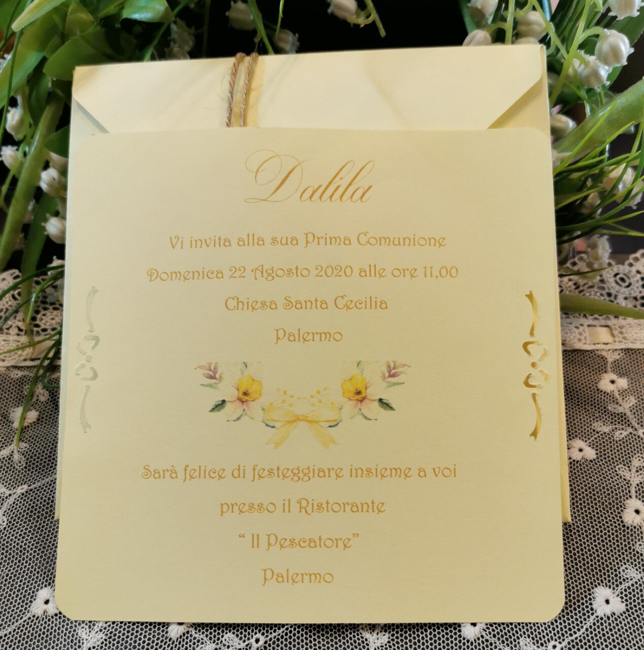 L'invito viene realizzato su Cartoncino pregiato gialla gr. 250, compresa di busta su richiesta anche bianca.