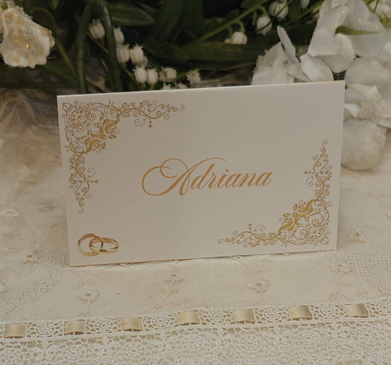 Realizzato a mano in cartoncino bianco con decoro oro arricchito con cristalli di strass.